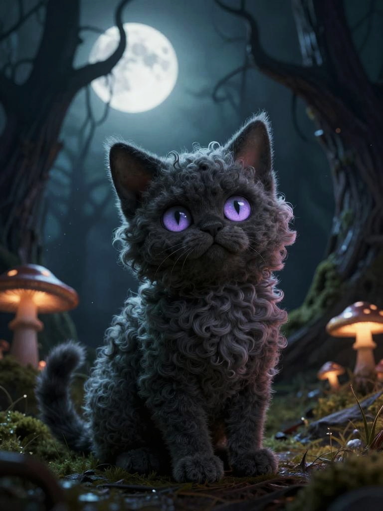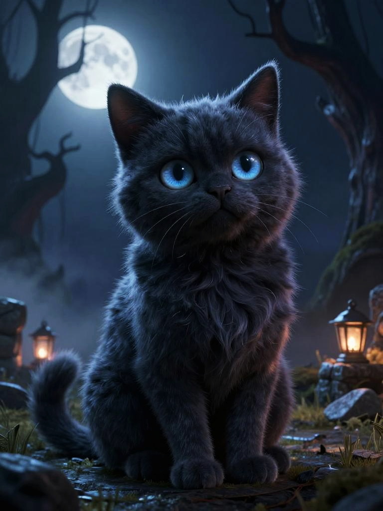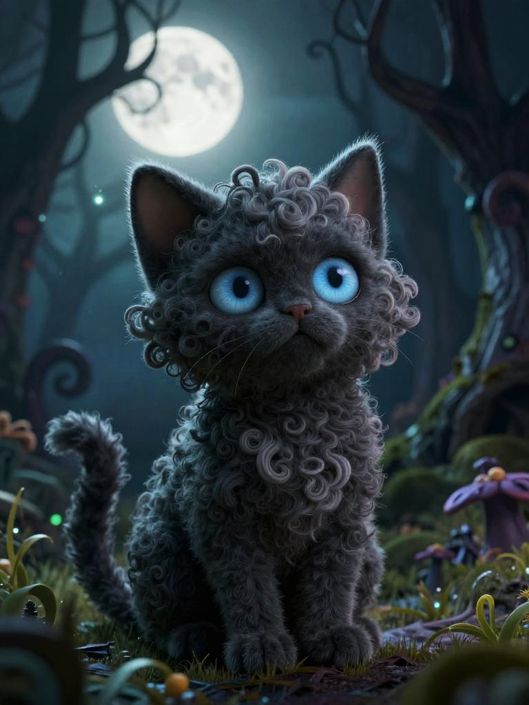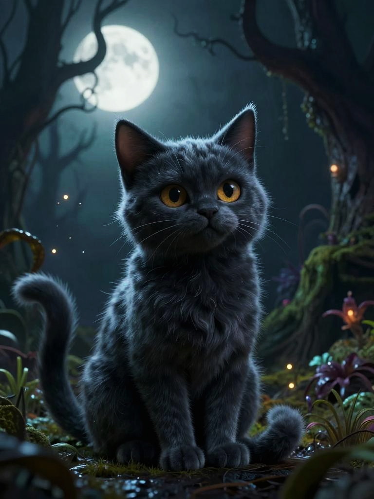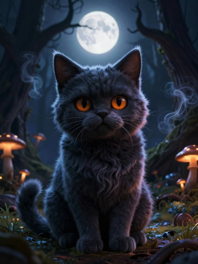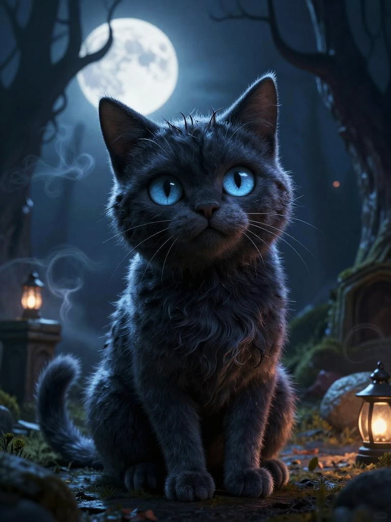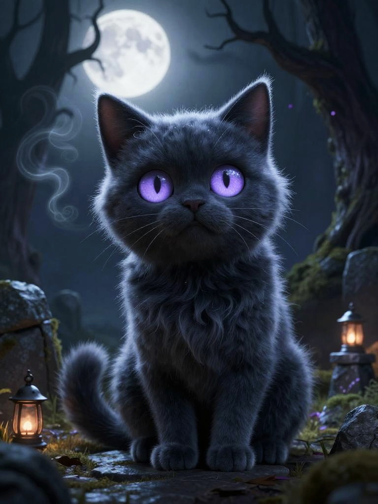 Spooky stylized cat sitting in a twisted haunted forest clearing, small fluffy gray cat with crooked ears, thick matted fur, enormous round soft amber eyes looking slightly worried at the viewer, tail curled beside its paws, surrounded by gnarled roots with scattered bones and trinkets under a glowing full moon, drifting sparkling dust drifting through the air, cinematic close-up with blurred background, highly detailed 3d illustration in dark whimsical fantasy style, cool dim silver backlighting light with subtle highlights on the fur