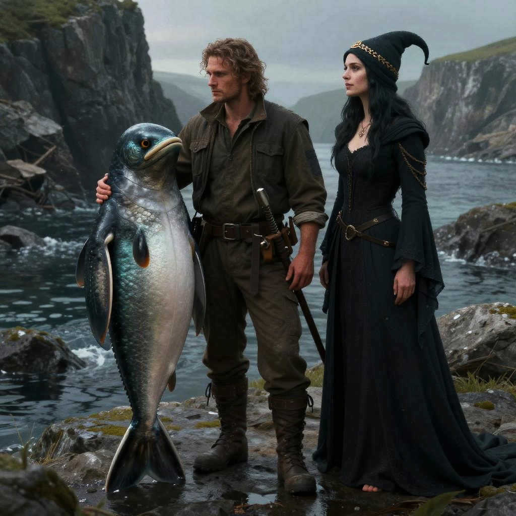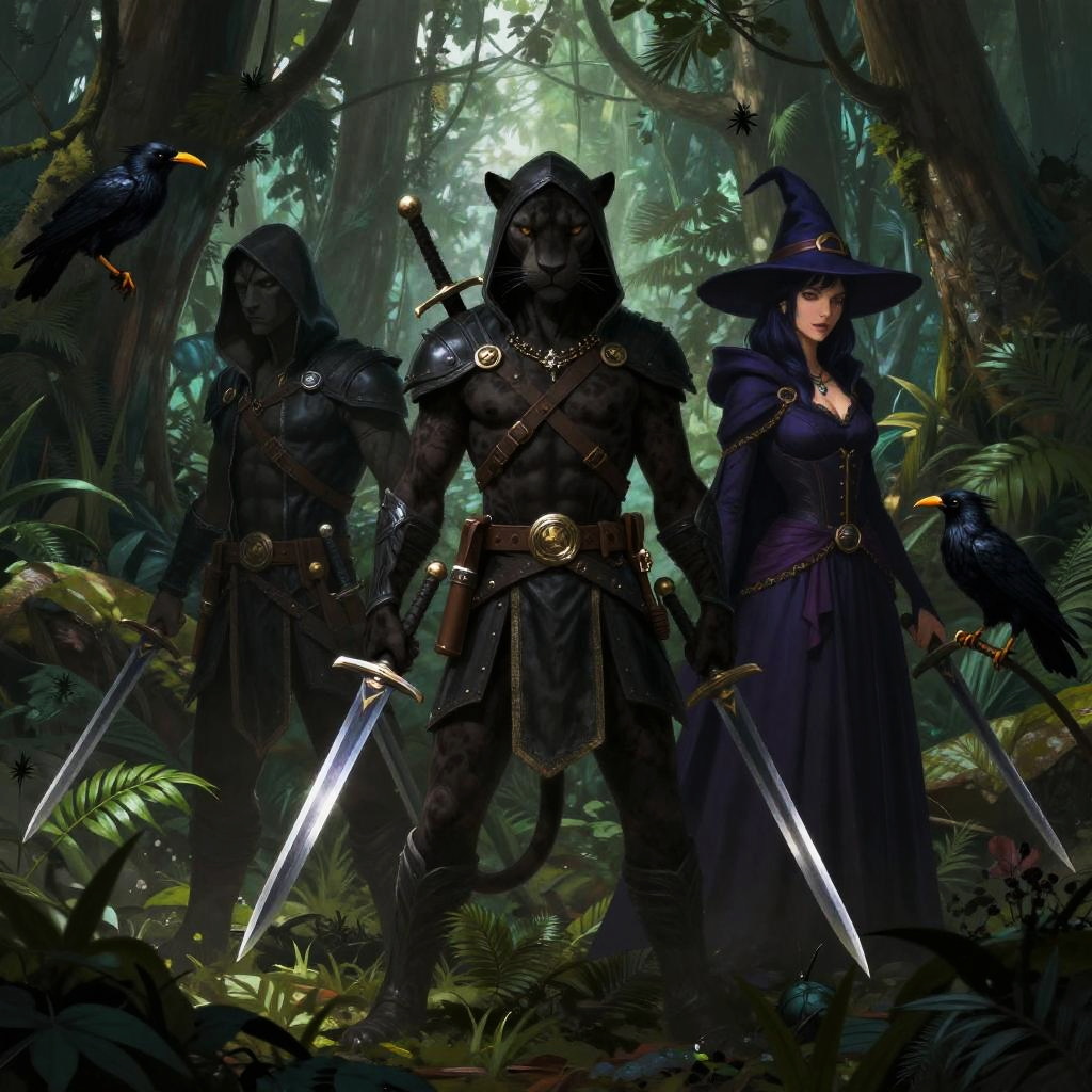A griffin, a woman with silver hair and leather armor, and a dwarf with a hammer, standing together in a rocky mountain pass, resolute and strong, styled for D&D, fantasy illustration, highly detailed