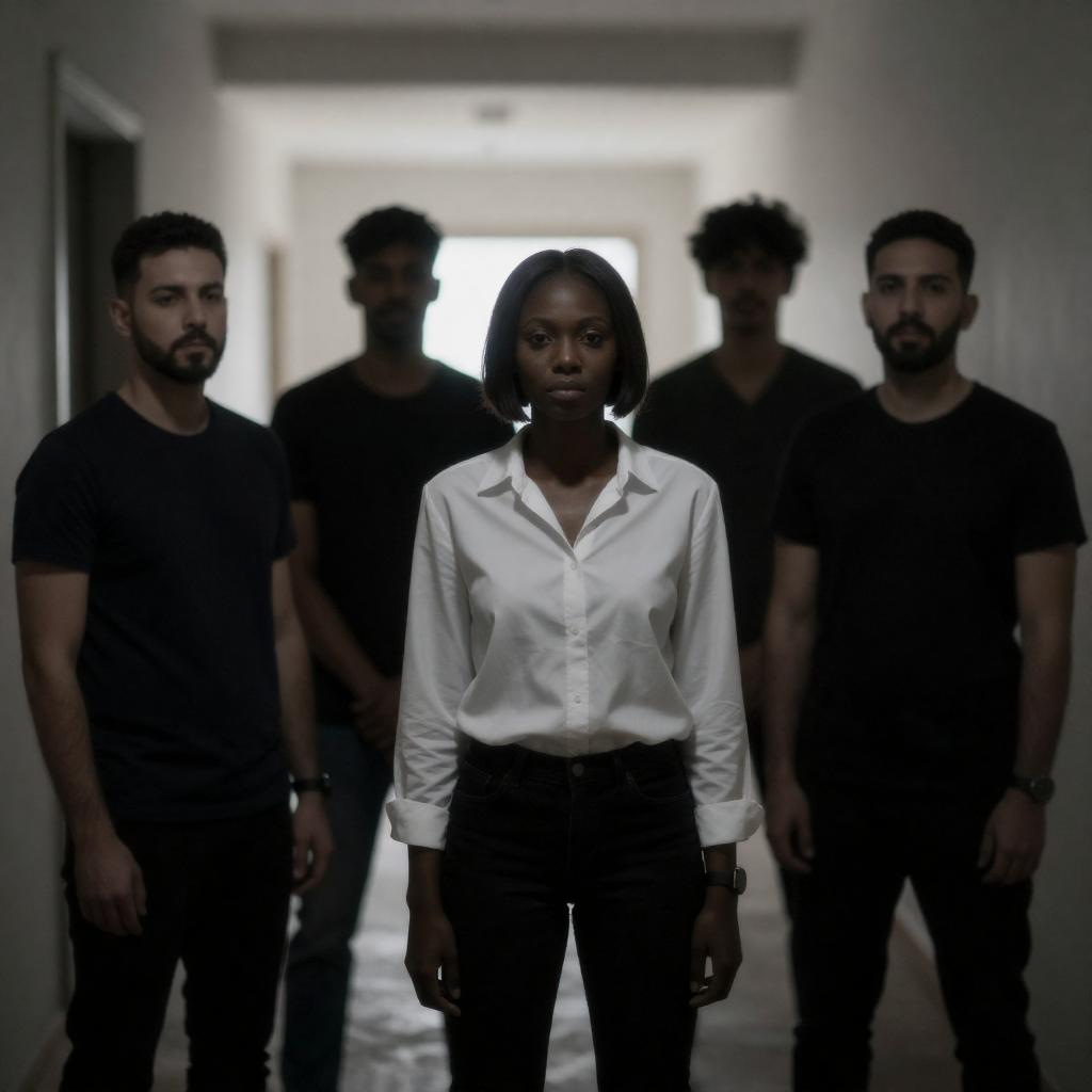 Black-and-white photograph of a man with a beard, wearing a white shirt and dark jacket, surrounded by metal pipes and coils. His face is partially obscured by the industrial equipment. Two other people are partially visible in the background. Intense expression.