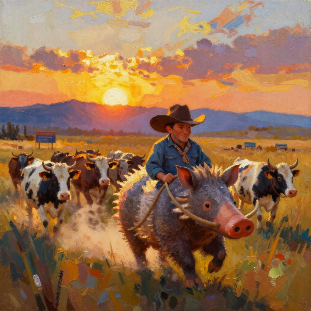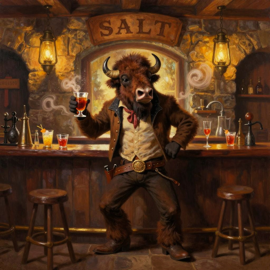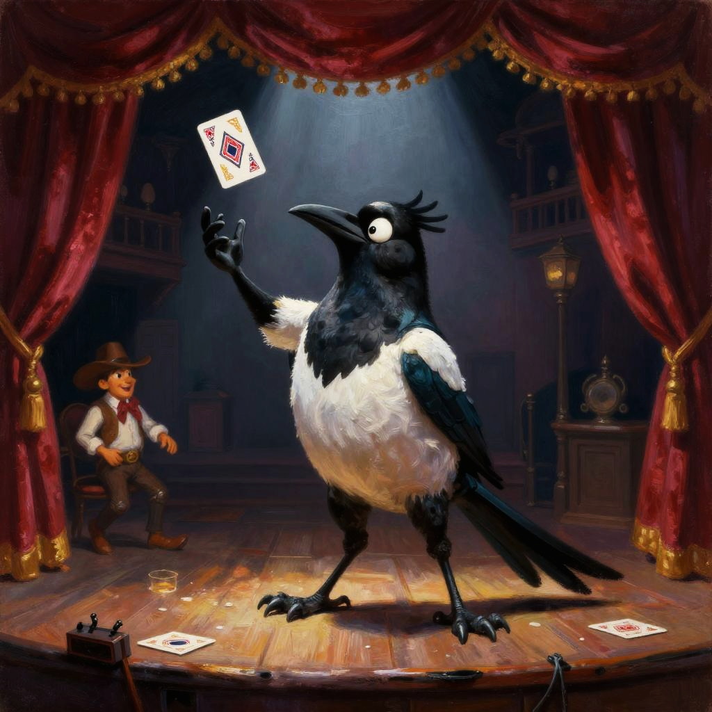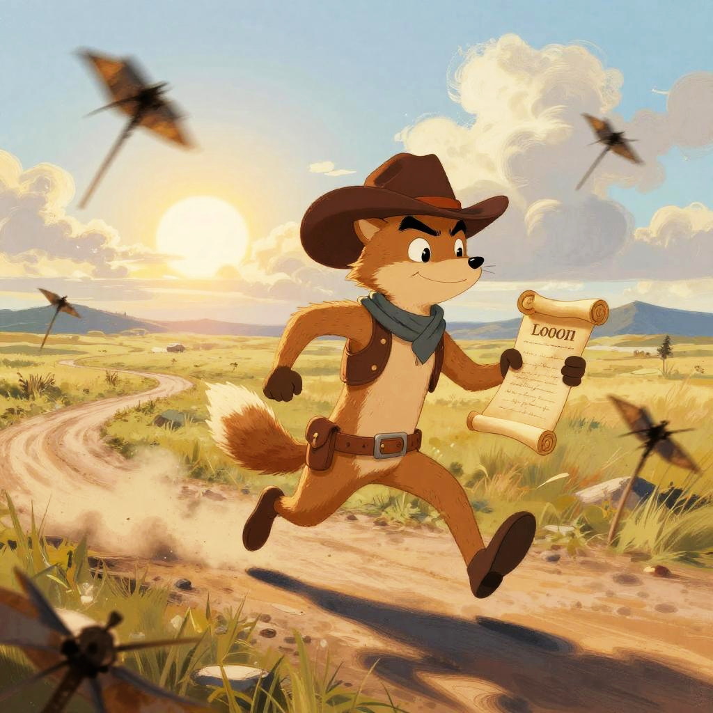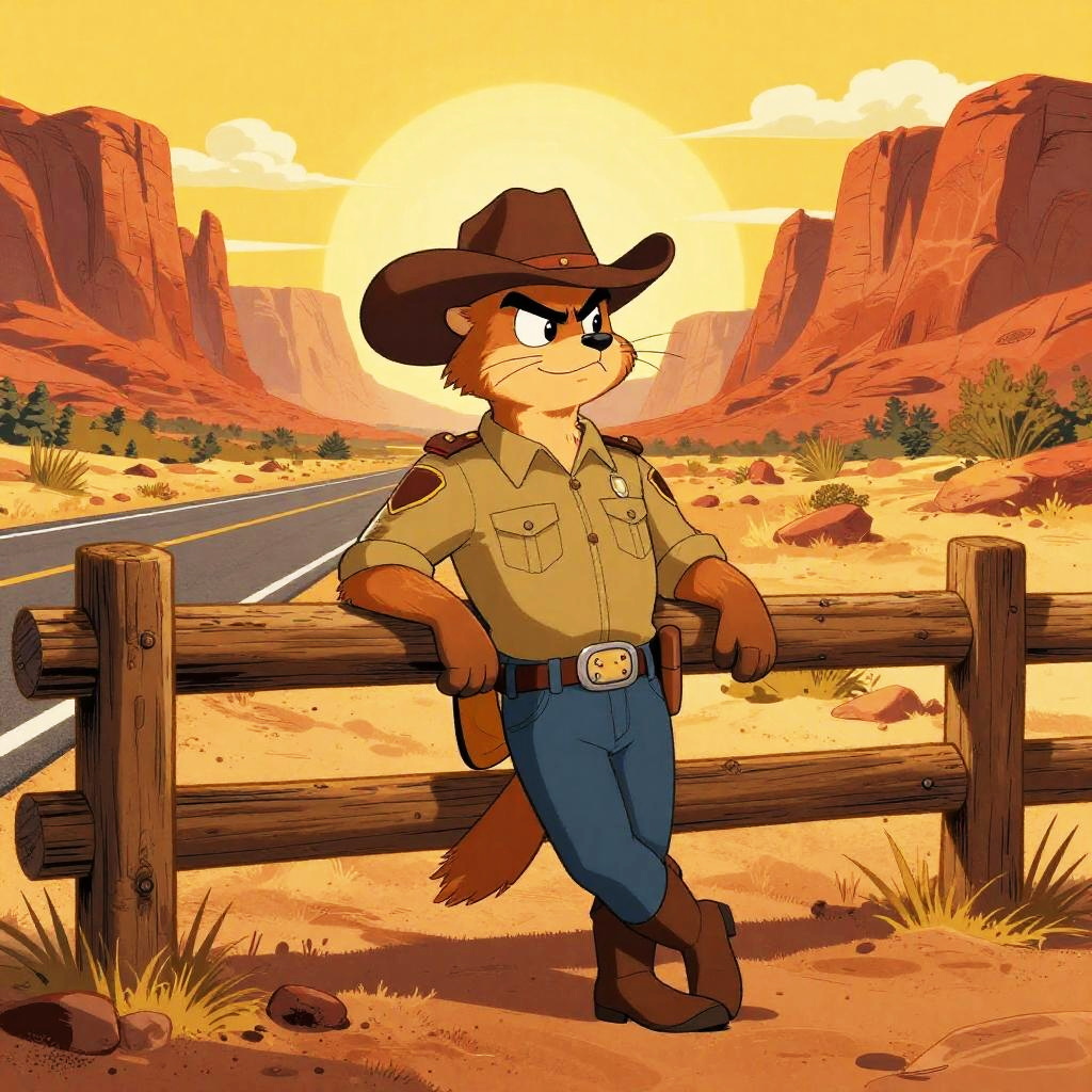 Anthropomorphic hawk stagecoach guard scanning horizon at sunset-lit rocky pass with silhouetted cactus, playful western scene in dramatic cinematic style with deep shadows and saturated warmth; warm rim light, lively motion, dust motes and signage details, confident pose, cinematic depth, bold shapes, whimsical yet heroic mood, rich complementary colors, subtle texture, crisp outlines