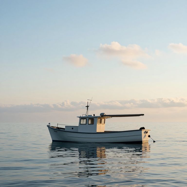Serenity whispers through the calm waters as the fishing boat rests under a sky of soft clouds, embodying a timeless connection to nature and the quiet promise of new beginnings.
