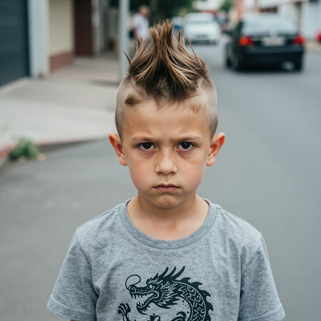 Platinum blonde hairstyle, photograph of a young blonde boy with messy hair, blue eyes, and fair skin, wearing a light beige t-shirt, standing against a weathered, beige wall, serious expression, natural lighting, realistic, portrait, daytime, casual clothing, soft shadows