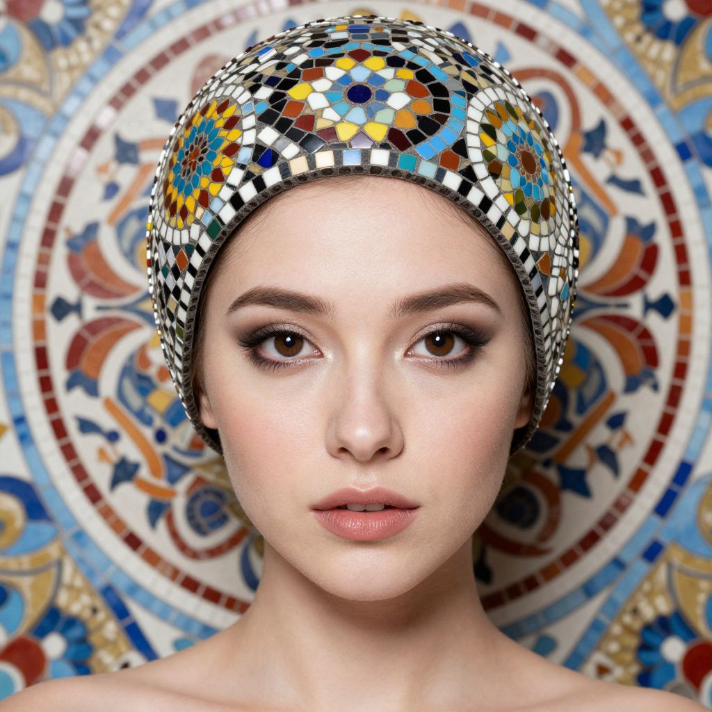 Photograph of a fair-skinned woman with a symmetrical face and large, almond-shaped brown eyes. She wears a colorful mosaic headpiece featuring black, white, blue, yellow, and orange tiles in a circular pattern. Her dark brown hair is completely covered by the headpiece. The background is a detailed, circular mosaic with similar colors and patterns, creating a harmonious, ornate effect. Her makeup is minimal, emphasizing her natural features. The image has a high contrast and sharp focus, highlighting the textures of the mosaic tiles and her smooth skin. She appears to be topless, with the focus solely on her face and head.