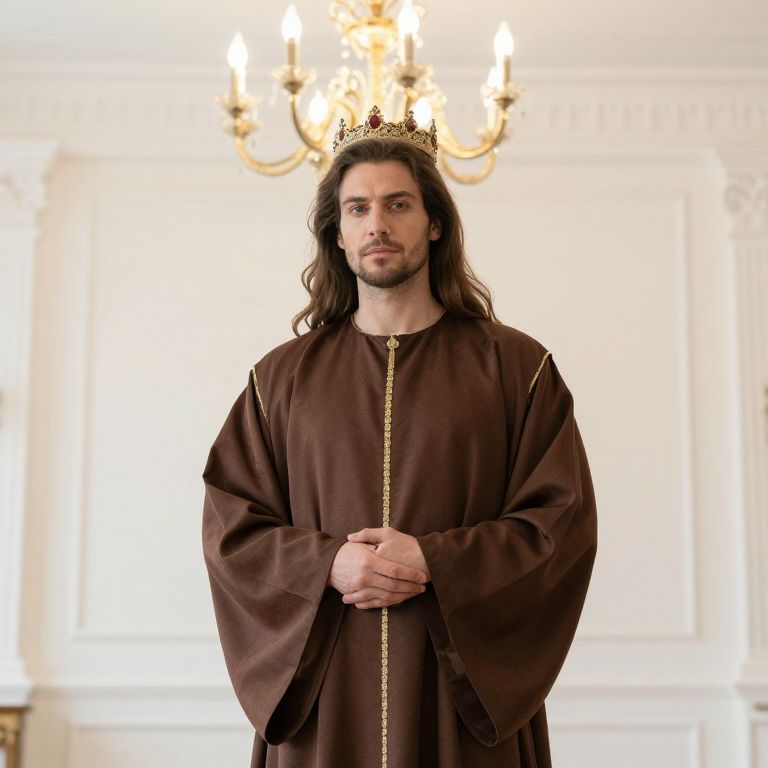 A person is wearing a brown robe with a crown on their head. They are standing in a room with white walls and a chandelier.