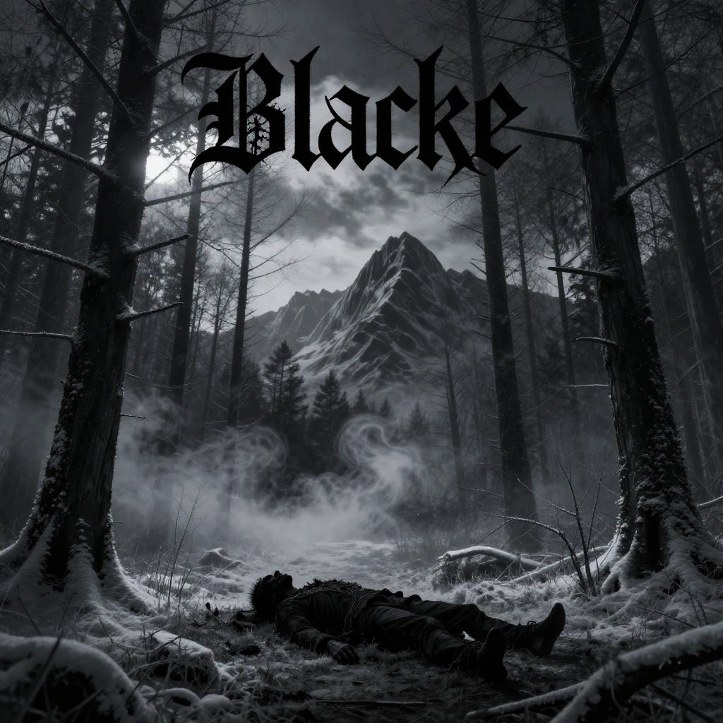 Black metal dead album cover featuring a desolate frozen forest at night, eerie mist swirling among dead trees, a dark silhouette of a corpse lying on the ground, jagged mountains in the background, monochrome palette with high contrast shadows and sinister atmosphere.