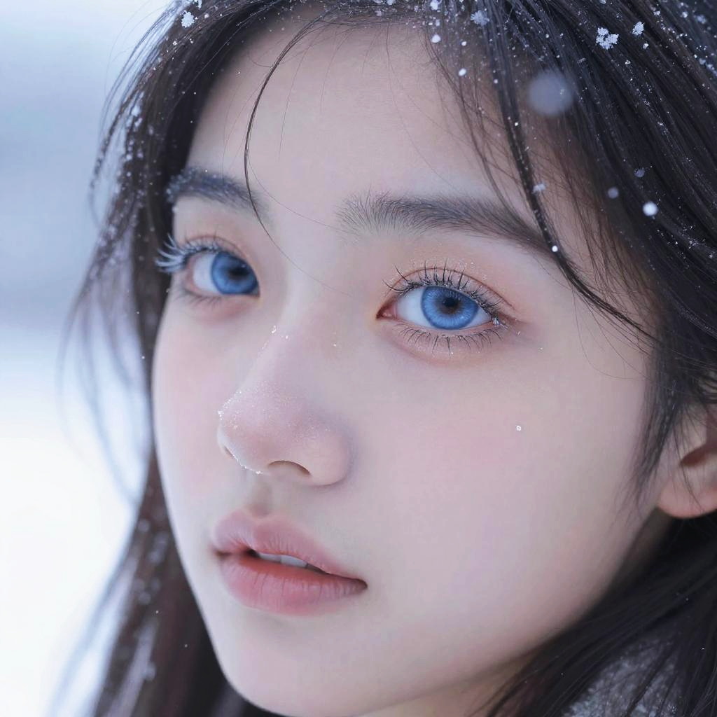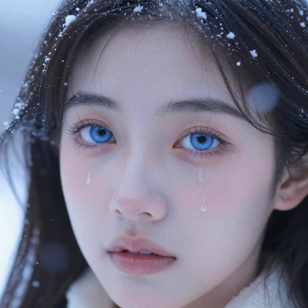 Close-up of bright blue eyes amid swirling snowflakes, frozen tears glistening, pale skin flushed from the cold, soft light creating a mystical winter wonderland feeling, crisp snow covering hair strands, an enchanting blend of warmth and chill.