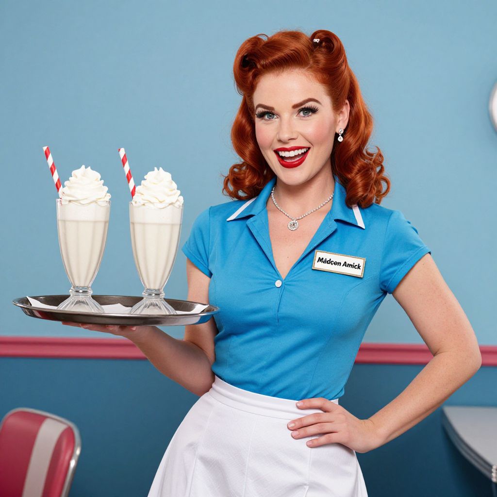 In this vibrant and nostalgic image, a woman with striking red hair styled in curls, reminiscent of classic pin-up art, stands confidently with a radiant smile. She is dressed in a blue top and white skirt, evoking the style of a 1950s diner waitress, complete with a name tag that reads \"Mädchen Amick.\" Her outfit is accessorized with a delicate necklace and earrings, adding a touch of elegance to her look. In her hand, she holds a tray adorned with two milkshakes, each garnished with a red and white striped straw and a generous swirl of whipped cream. The background is a soft, muted blue, providing a calm contrast to the vivid colors of the woman's attire and the milkshakes. The overall composition, with its comic book pin-up style art, captures a moment of joy and nostalgia, reminiscent of the iconic Twin Peaks diner scene.