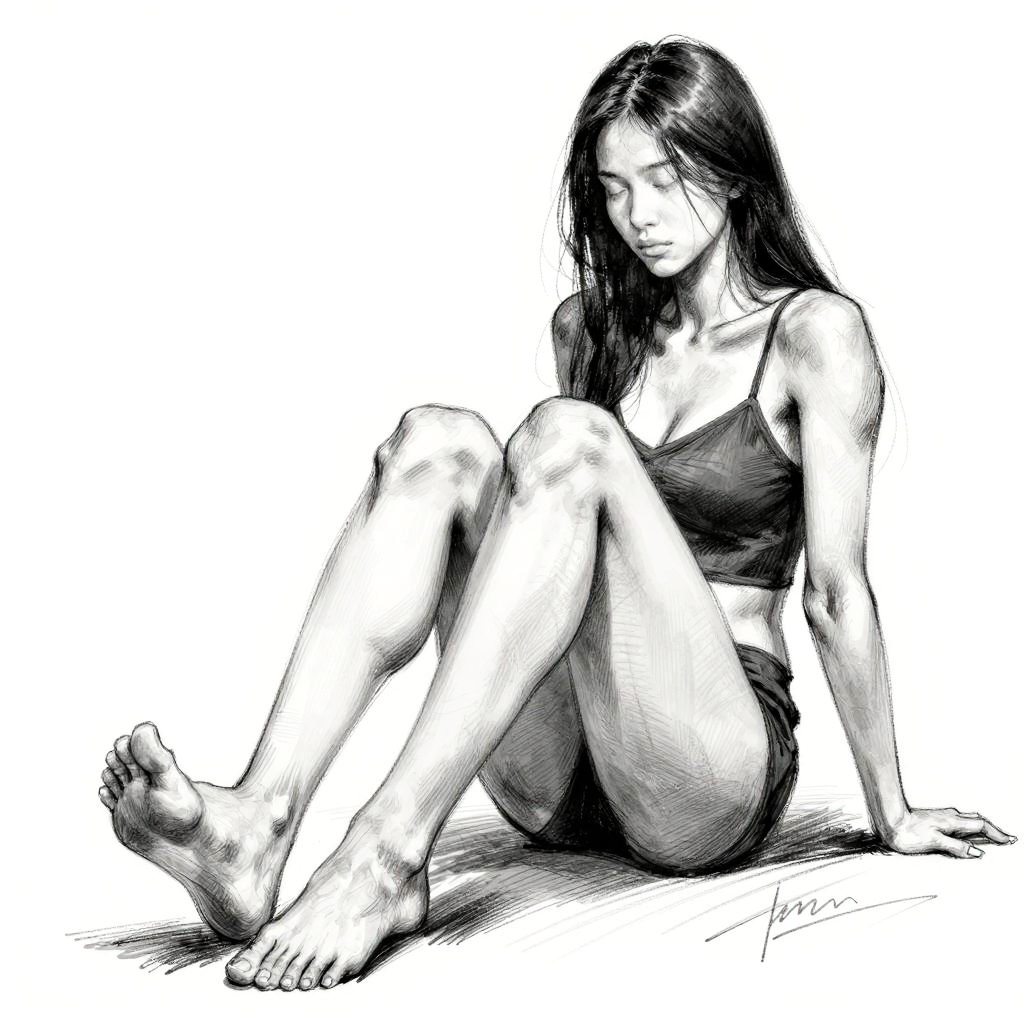 This is a black-and-white digital sketch of a woman with long hair, sitting on the floor with her legs bent and feet in the foreground. She's nude, and her expression is slightly hidden by her hair. The sketch uses detailed cross-hatching and shading to emphasize her muscular legs and feet. The background is plain, making the figure the focal point. The artist's signature is in the lower right corner.