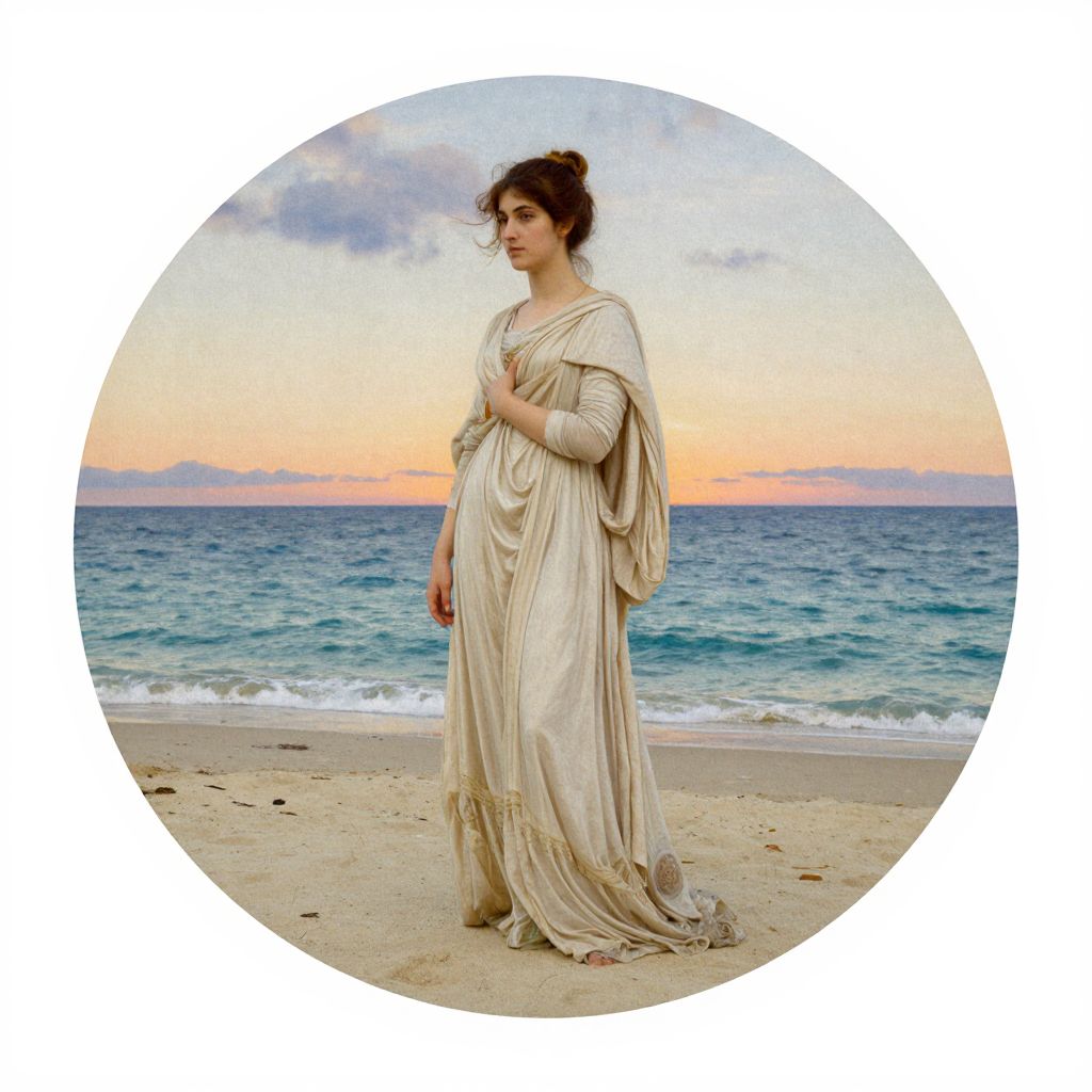 Circular beach towel featuring Dante Gabriel Rossetti's \"La Donna Della Finestra,\" depicting a woman in a flowing cream gown standing on a sandy shore with a serene ocean and sunset backdrop.