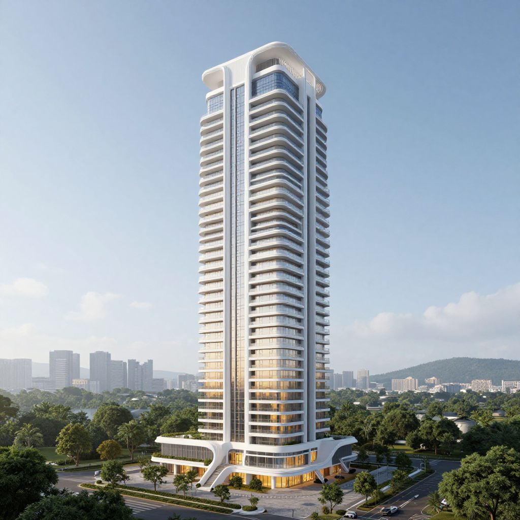 A futuristic 3D-rendered skyscraper stands tall against a clear sky, its sleek white structure adorned with cascading balconies and warm-toned interiors, evoking a sense of modern elegance and innovation, while the distant cityscape and lush greenery below add depth and context to this high-definition architectural vision.
