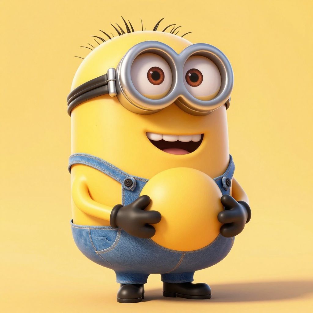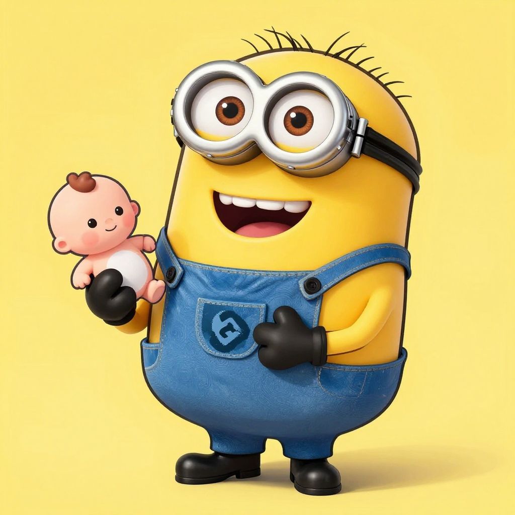 Digital illustration of Minion-style character with a yellow round head, large goggles, and blue denim overalls with black gloves and shoes. He has black spiky hair and is smiling with a tooth visible. He holds a small, pink, baby-like plush toy with a brown dot on its head. The background is a solid yellow, making the character and toy stand out. The illustration is colorful and cartoonish, with a smooth, glossy texture.
