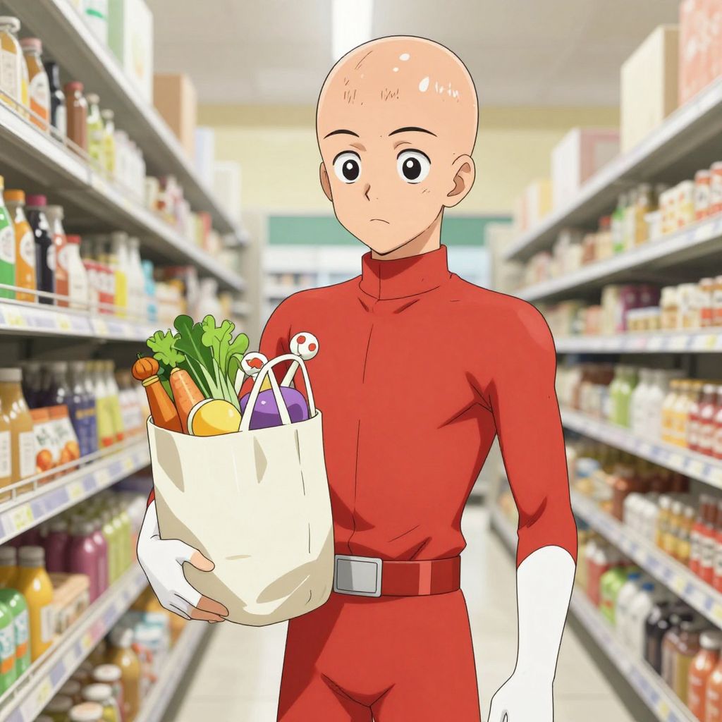 Saitama casually grocery shopping, holding a bag of groceries while wearing his superhero costume, humorous everyday moment captured with anime art style, soft shadows and warm lighting, detailed background showing grocery store aisle