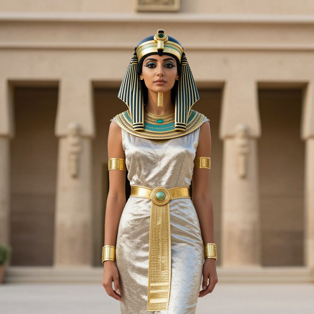 Photograph of a woman in an Egyptian-style silver dress with gold accessories, striped headdress, and turquoise necklace, standing in front of a stone building