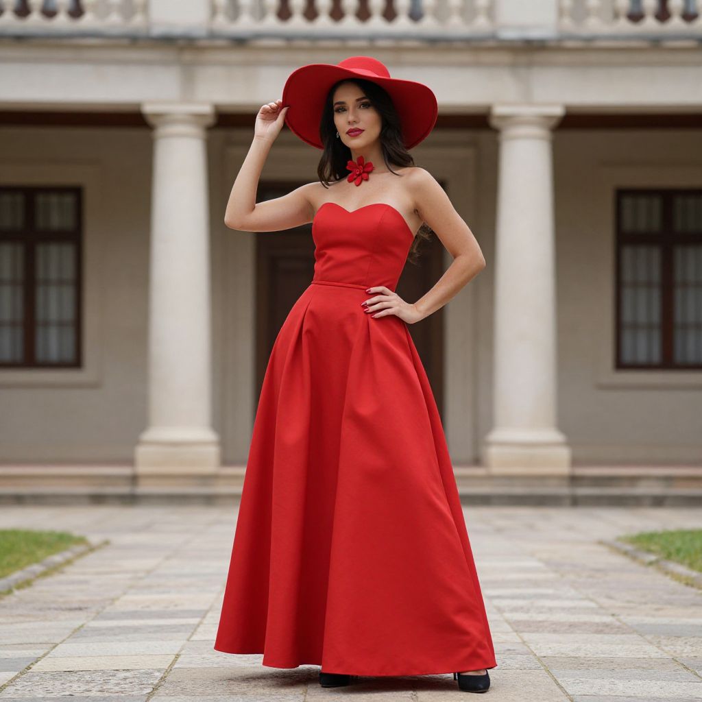 Photograph of a fair-skinned woman with long black hair and red lipstick, wearing a strapless, vibrant red, full-length gown with a sweetheart neckline and a high-waisted, A-line silhouette. She is also wearing a wide-brimmed, red hat adorned with a red flower choker. She stands confidently on a stone pathway, with her right hand adjusting her hat and her left hand on her hip. In the background is a classical building with white columns and large windows. The setting suggests an elegant, historical location. The overall style is glamorous and sophisticated.
