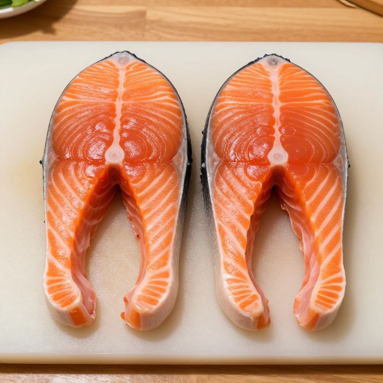 Photograph of two fresh, vibrant orange salmon fillets with white and red marbling, placed side-by-side on a white cutting board.