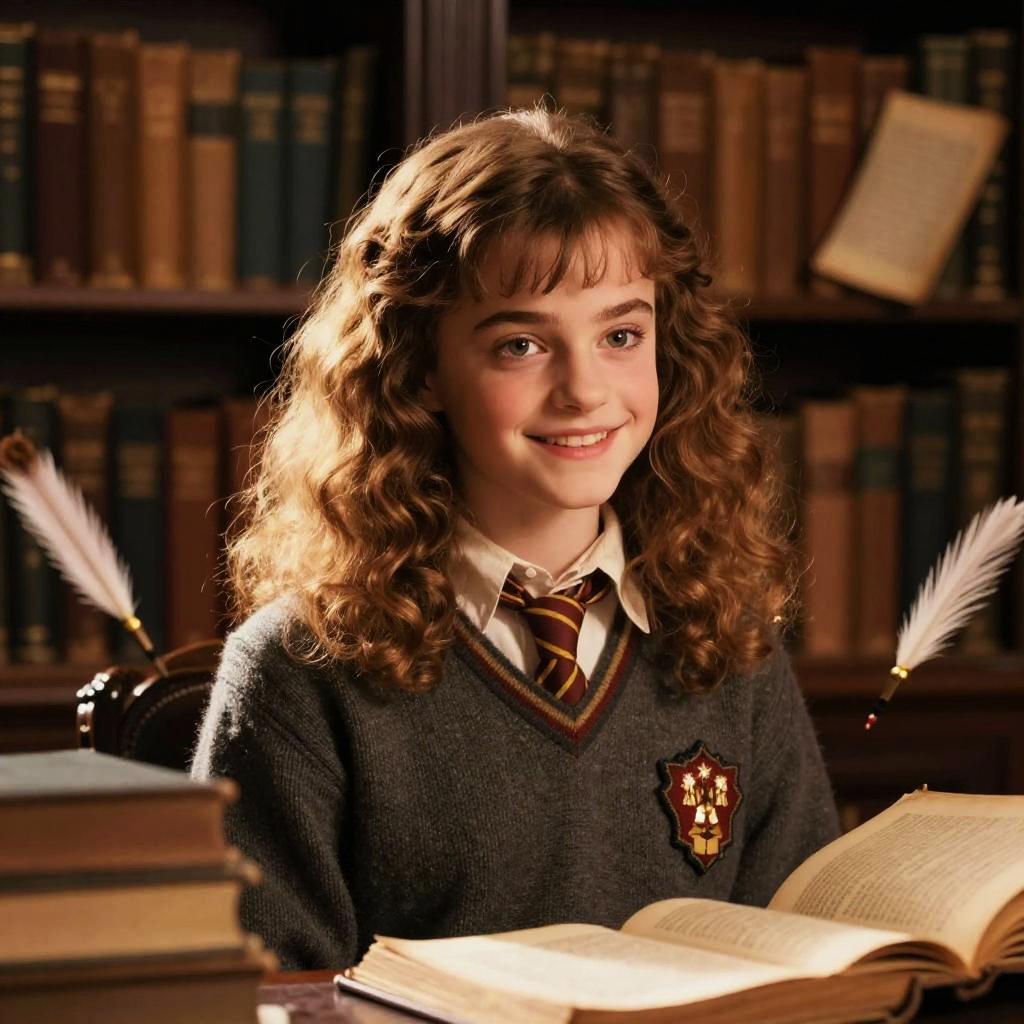 Hermione smiling softly under a starry night sky, standing near a tranquil lake reflecting shimmering constellations, wearing a cloak that subtly glows with magical runes, serene and mystical mood, capturing the wonder of magic and knowledge.