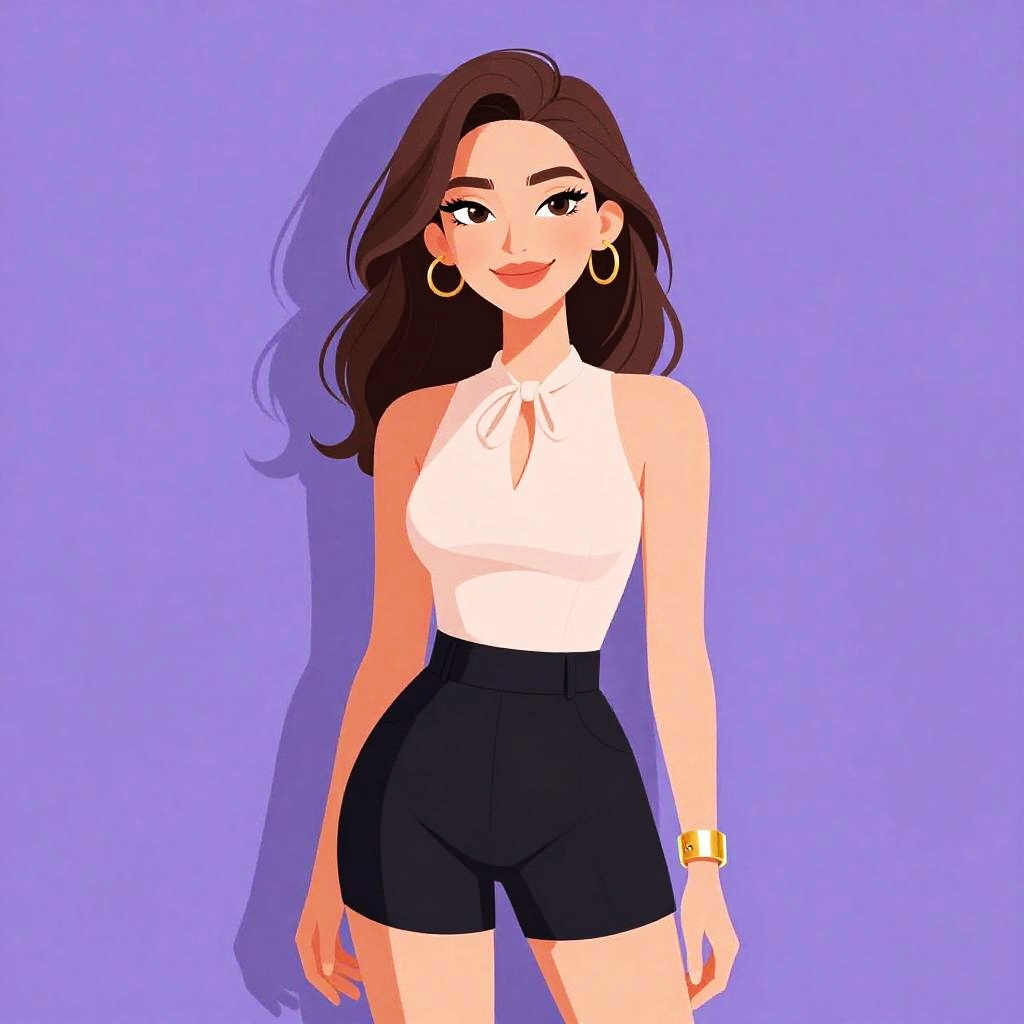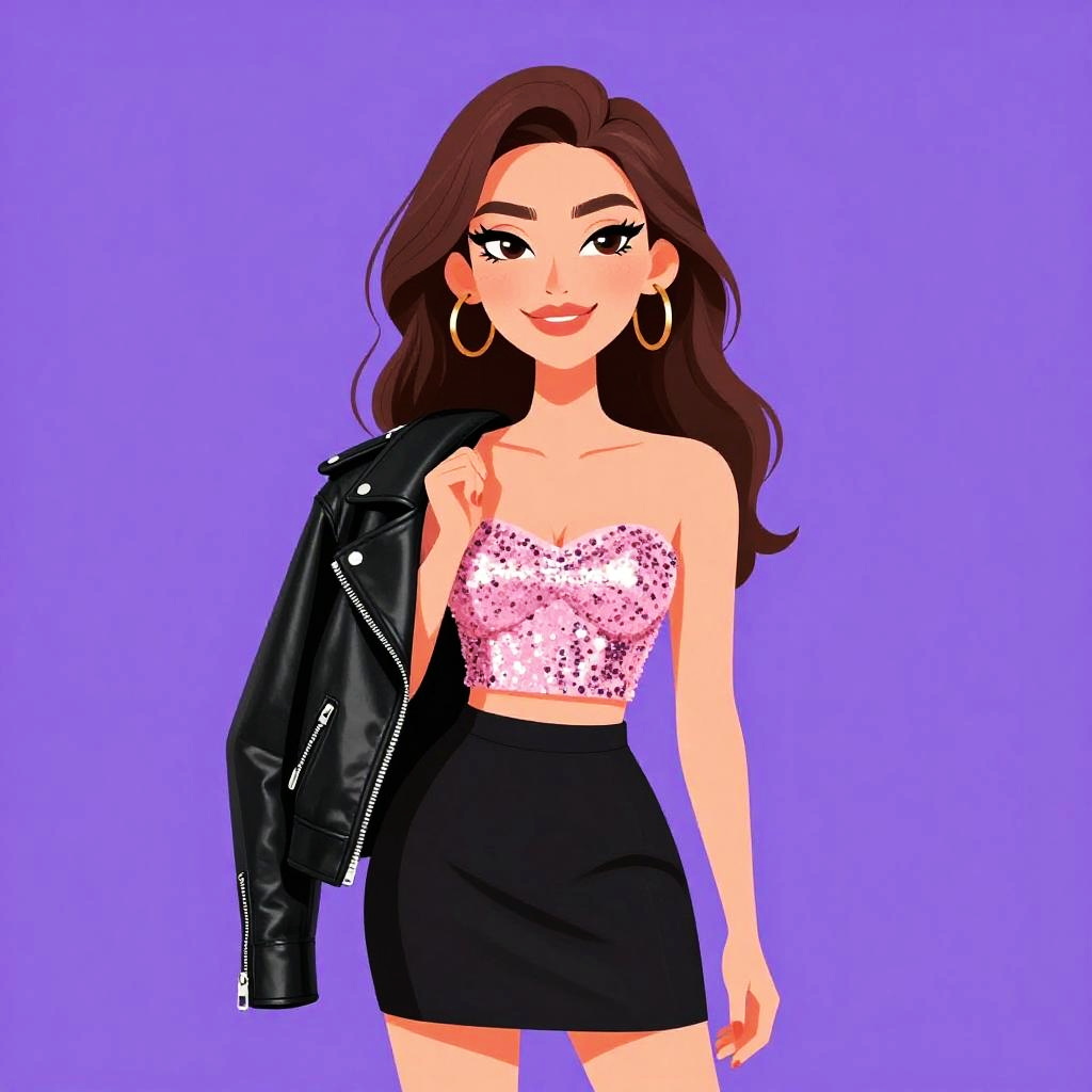 Woman with pretty face and pretty hair. Woman, glam rock, gold sequined tank top with spaghetti straps, black faux leather leggings, fitted silhouette, minimalist gold bracelet, dangling earrings. --sref 1467