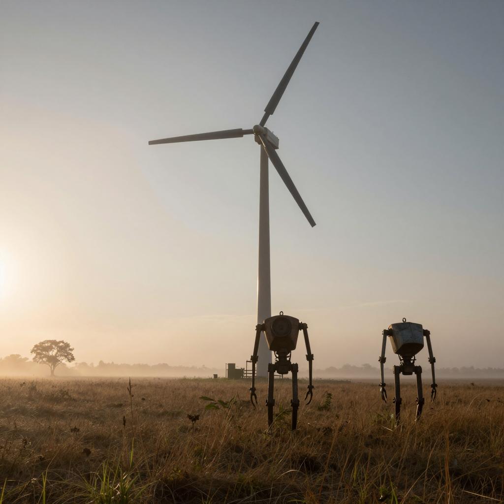 Wide-Angle Travel Photography skinny wind turbine mechs walking through a field at sunrise, 1930s, Oklahoma, fog, sunlight, summer, style of Simon Stålenhag, atmospheric, volumetric lighting, photorealistic,