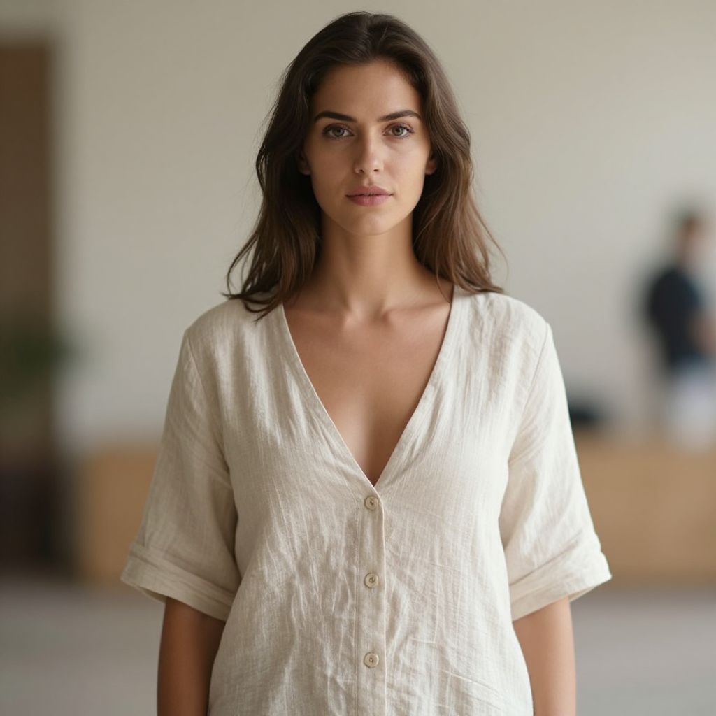 Photograph of a young woman with long, wavy brown hair and light olive skin standing indoors. She has a serious expression and is wearing a loose-fitting, white, linen shirt with a deep V-neck and short sleeves, buttoned down the front. The background is softly blurred, showing a beige wall and a wooden shelf with indistinct objects. The lighting is natural, highlighting her clear complexion and subtle makeup. The overall style is casual and minimalist.