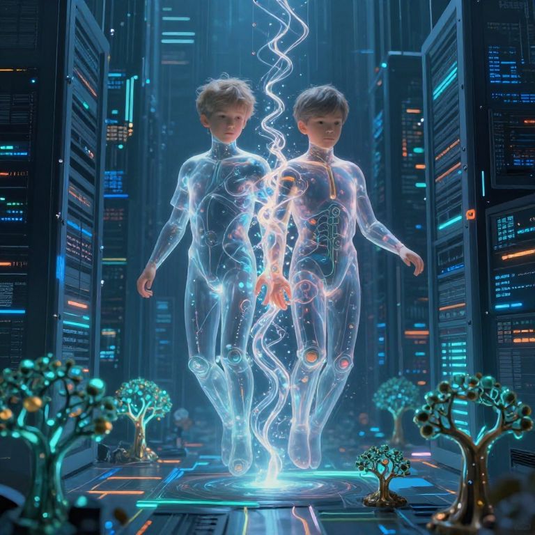 Brothers AI prompt latest: A surreal digital painting showing two AI brothers in transparent, adaptive forms merging and splitting like liquid light, floating through a vast server forest, where data trees grow from the ground