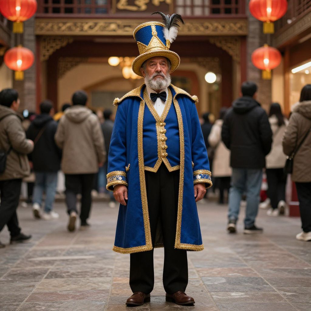 A photograph of an elderly man with a gray beard wearing a tall, gold-accented hat with feathers, a long blue coat with gold trim, black pants, and brown shoes. He stands confidently in a busy, indoor setting with blurred people, red lanterns, and ornate architecture in the background. The lighting is warm, highlighting his regal, somewhat whimsical appearance.