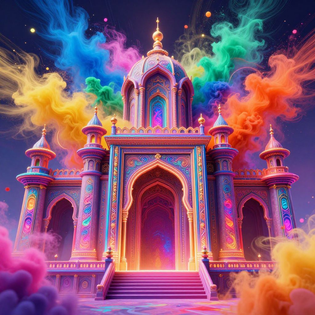 The image depicts a stunning, vibrant scene reminiscent of a Holi festival, with neon colors bursting forth in a dynamic, almost explosive manner. The central focus is a grand, ornate structure, possibly a castle or palace, adorned with intricate details and a large, arched doorway. Surrounding the structure, colorful smoke and powder clouds in shades of blue, green, yellow, orange, and pink create a sense of movement and energy. The scene is illuminated by bright, neon lights that cast a warm glow, enhancing the vividness of the colors. The overall composition is highly detailed, with a depth that suggests a three-dimensional space, and the interplay of colors and textures creates a psychedelic, almost otherworldly atmosphere. The image is rich in intricate gradients and patterns, evoking a sense of elegance and complexity. The scene is reminiscent of the work of artists like Devo and Tristan Eaton, with its hyperrealistic, 8k quality and the use of liquid rococo fractals. The image is rendered with the Unreal Engine, using the Octane Render engine, and features 4fluid acrylic and elegant gradients, capturing the essence of a vibrant, joyful celebration.