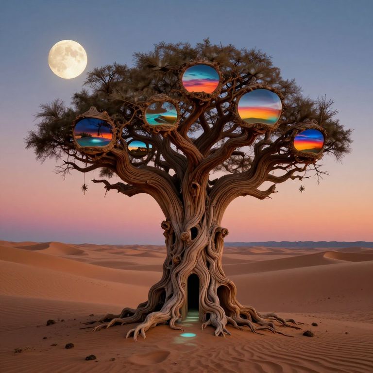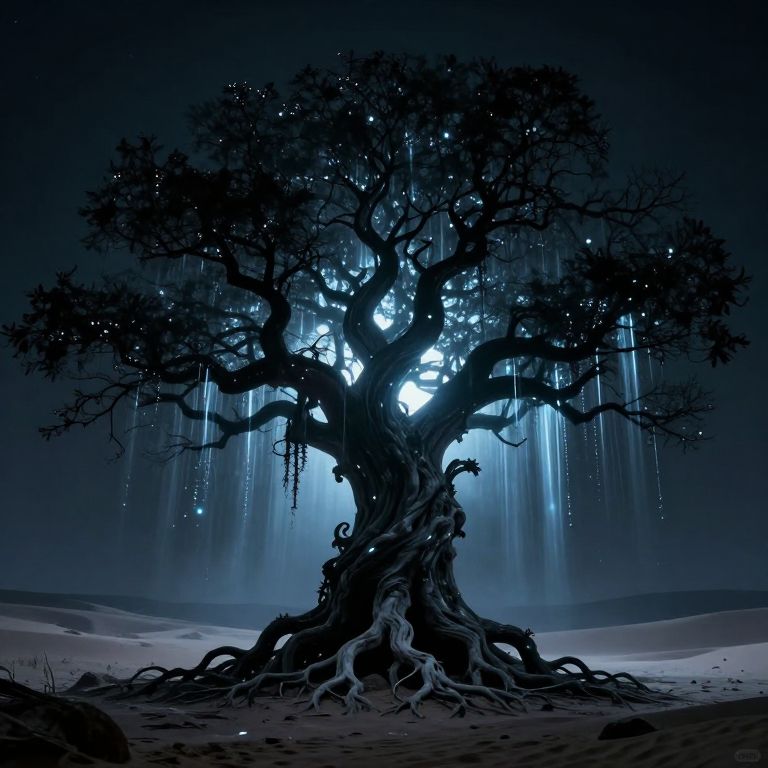 A gnarled, ethereal tree stands defiantly against a twilight sky, its branches adorned with cascading streams of bioluminescent light that rain down like liquid stars onto a desolate, moonlit desert below.