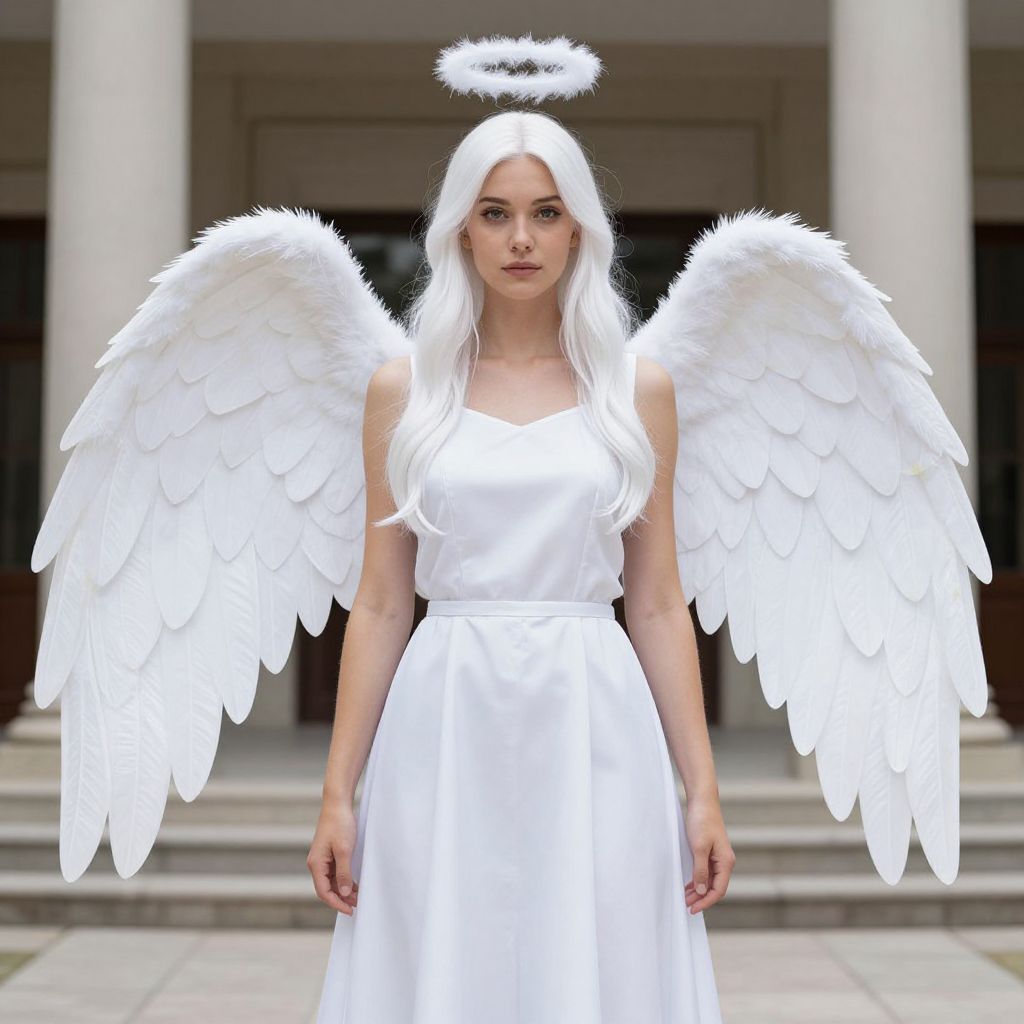Seraphim Angel Costume, angel with white wings and a halo standing in front of a building