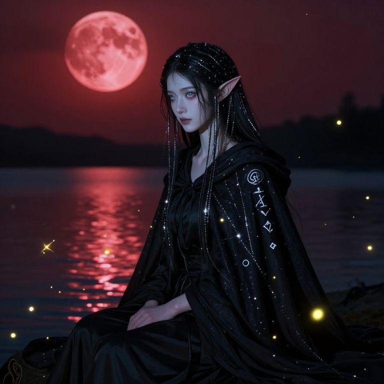 A serene dark elf with delicate, haunting features—sharp nasal bridge, high forehead, and soft silver-blue eyes—sits by a glowing lake under a blood-red moon, her dark hair woven with tiny silver threads that shimmer like starlight, a mysterious cloak floating around her, surrounded by floating fireflies that form symbols of forgotten lore.