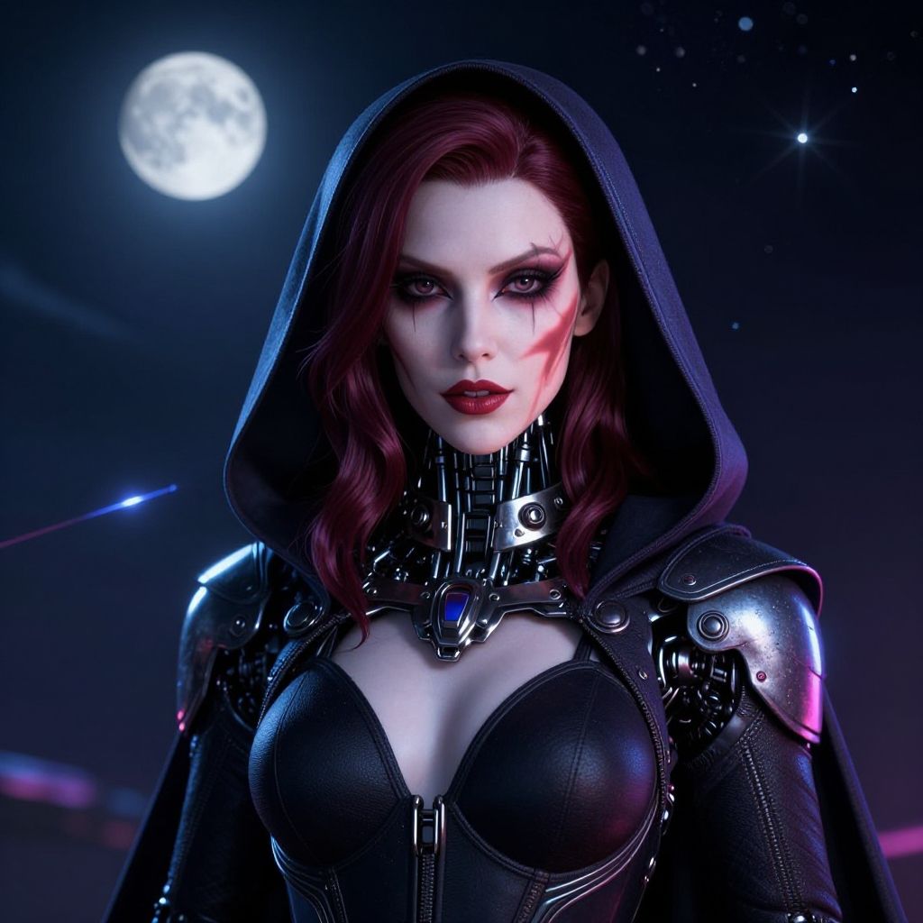 This is a digital CGI artwork of a striking woman with pale skin and dark red hair, wearing a black hooded cloak. Her intense purple eyes are accentuated by dramatic black eyeliner and dark red lipstick. She has black smudges on her cheeks. Her outfit includes a black, form-fitting leather top with a choker adorned with metallic spikes. The background is a night sky with a bright full moon and stars, adding a mystical atmosphere. Her armor-like shoulders have a glossy, metallic texture, reflecting the moonlight. The overall style is dark and gothic, with a futuristic touch.