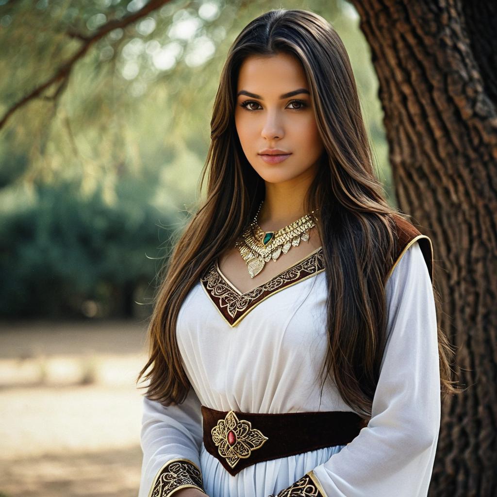 A photorealistic image of a young woman wearing an ancient Greek-style teal dress with gold accents and intricate draping over one shoulder. She stands on a sunlit forest path surrounded by green trees. The woman has brown hair styled in a braided updo, gold bangles on her wrist, and a serious expression. The scene features warm natural light and detailed shadows, enhancing the realistic textures and makeup.