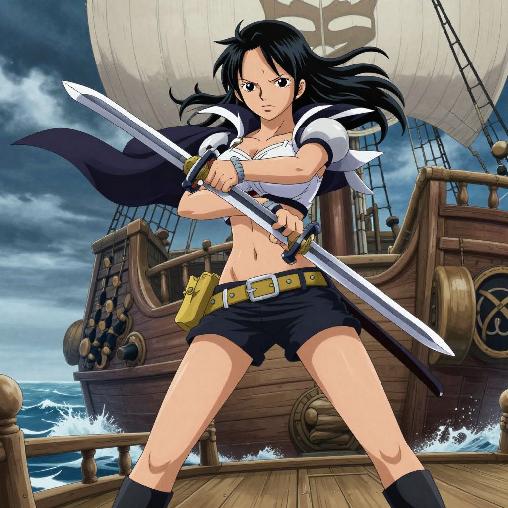 Who is the orange hair girl in One Piece in a fantasy manga style, dynamic battle stance, fiery orange hair illuminated by sunset, elaborate pirate gear, stormy seas and ship in background