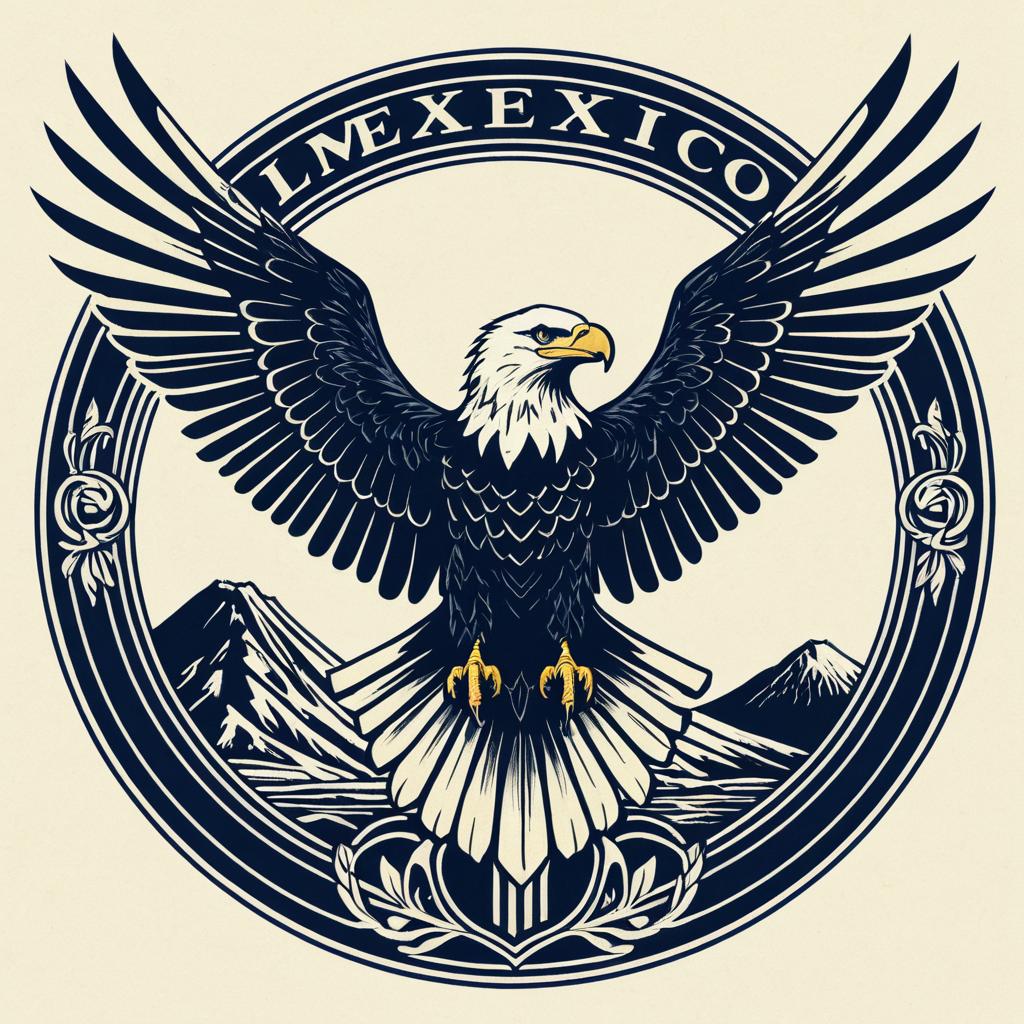 Illustration of a bald eagle with outstretched wings in a majestic pose. The eagle is depicted in high contrast black and gold colors, perched over a circular emblem inspired by Mexican symbolism featuring an eagle and serpent. The design is luxurious and emblematic, suitable for use as a powerful logo or crest.