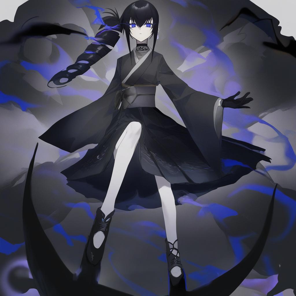 Ancient destroyer oni, kantai collection, 1girl, white skin, pale skin, blue eyes, glowing eyes, mole under eye, black hair, drill hair, long hair, anchor hair ornament, side ponytail, kimono, meiji schoolgirl uniform, kimono, meiji schoolgirl uniform, hakama skirt, black gloves, black footwear, wide sleeves, side drill, by artist takeyuu, illustrious