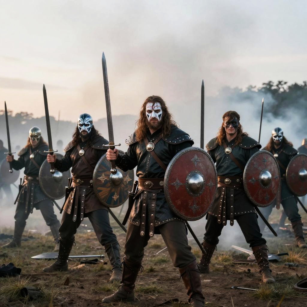Wide shot of a braveheart war paint clan preparing for war, painted faces reflecting fierce resolve, holding swords and shields, smoky battlefield, dawn light