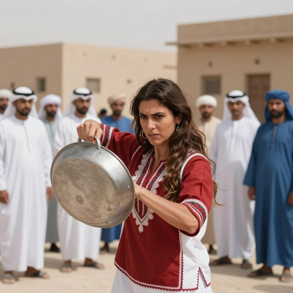 Woman with long brown hair, red and white embroidered blouse, holding large metal skillet, defensive stance, intense expression. Background: desert town, beige buildings, multiple men in traditional white and blue clothing, some with head coverings. Men in foreground and background, blurred, focused on woman. Bright daylight.