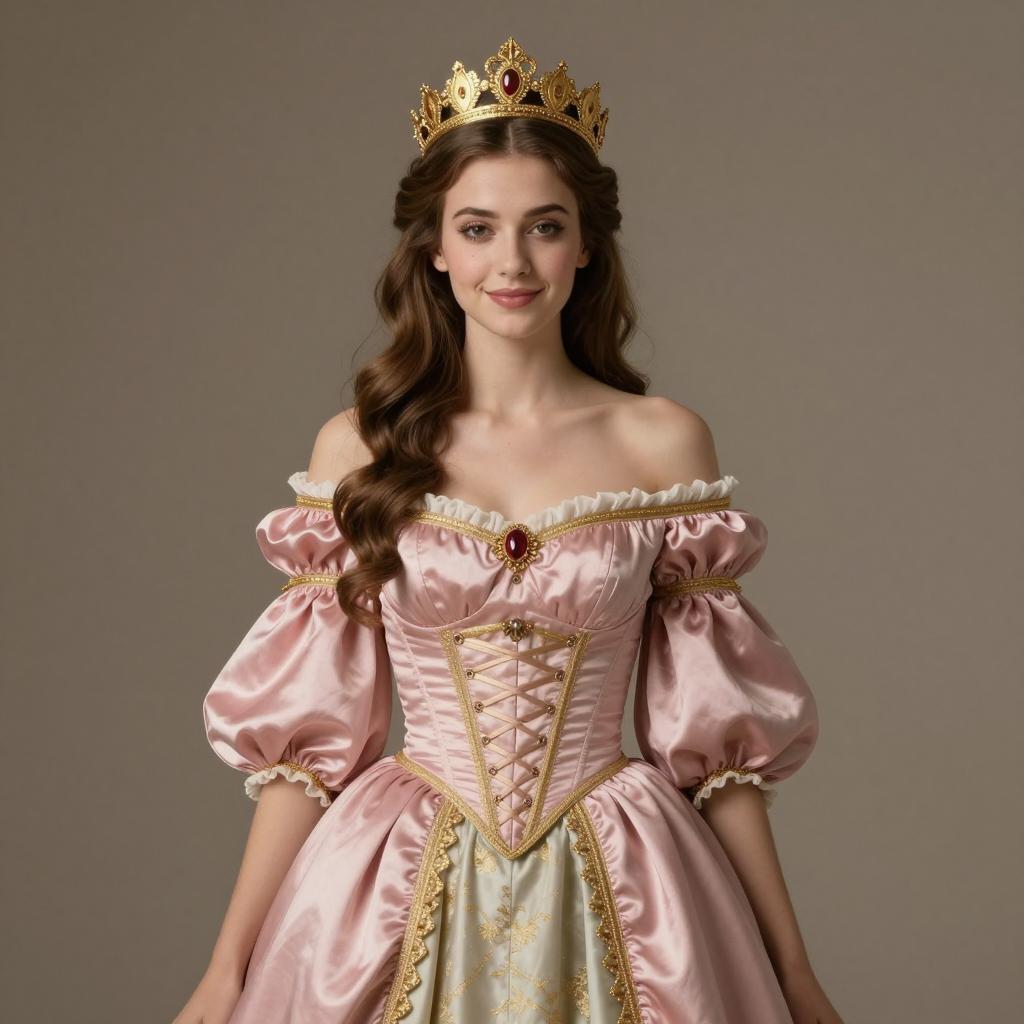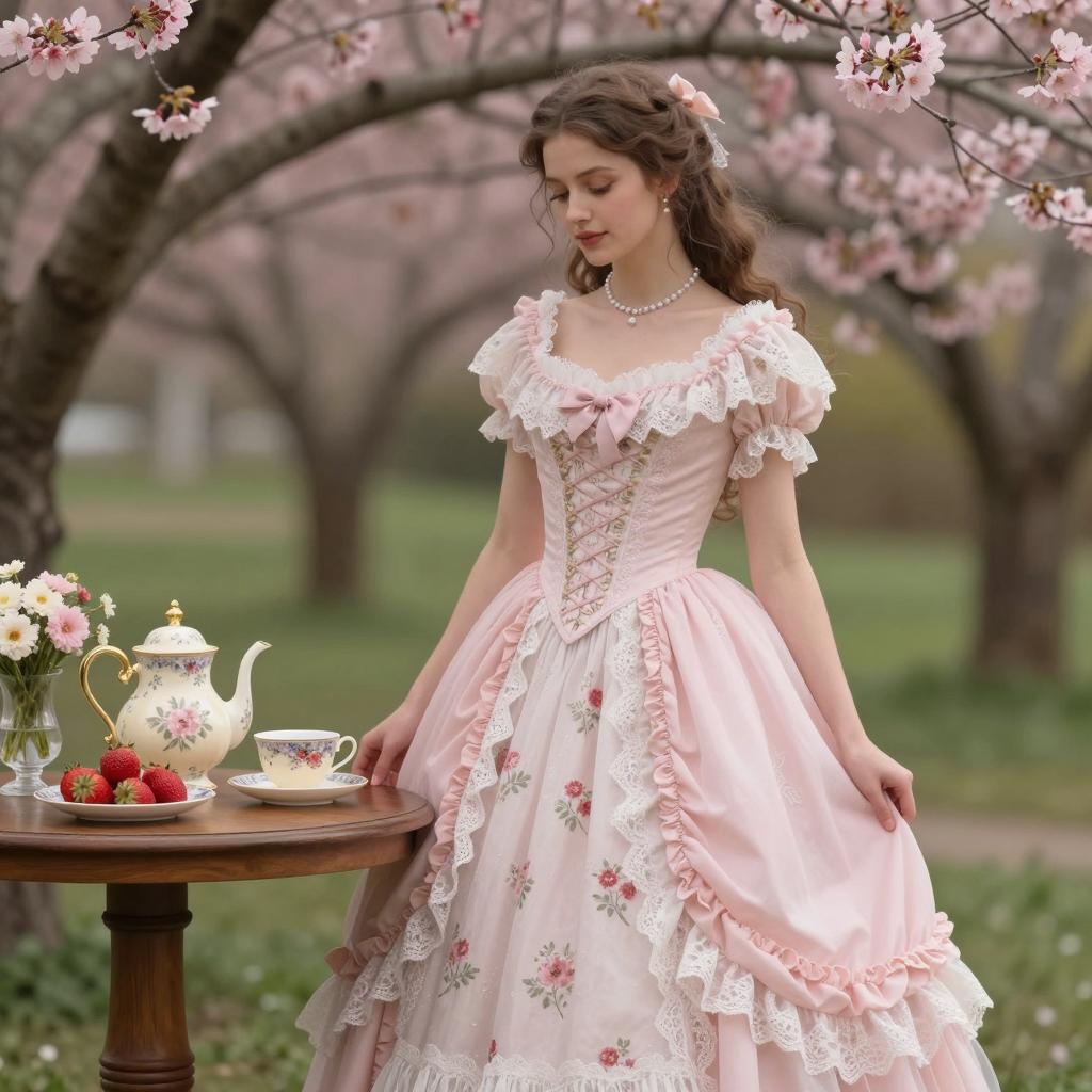 Gown design costume, photorealistic, portrait, young woman, standing, medieval-inspired dress, off-the-shoulder sleeves, teal and pink colors, intricate embroidery, floral patterns, cinched waist, full skirt, pink sash, brown wavy hair, updo, serious expression, soft natural light, cherry blossom tree, pink flowers, blurred background, greenery, daytime, outdoor setting, realistic ures, delicate, elegant, historical fashion, fantasy element
