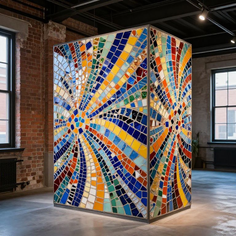 Inodoro artistic installation made from colorful mosaic tiles, located in an urban loft with exposed brick walls and industrial design elements, creative and vibrant, high contrast lighting, capturing the fusion of art and utility.