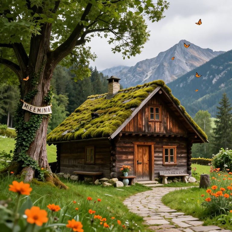 The image depicts a charming, rustic cottage nestled in a lush, forested area. The cottage, with its weathered wooden exterior and vibrant green moss-covered roof, exudes a sense of tranquility and warmth. A large, ancient tree stands guard to the left, its trunk adorned with ivy and a banner that reads \"MIEELMININ.\" The entrance to the cottage is marked by a sturdy wooden door, flanked by a stone bench and a small table with a vase of flowers. The surrounding landscape is dotted with vibrant orange flowers and a winding stone path leading up to the cottage. In the background, majestic mountains rise against a backdrop of a cloudy sky, with butterflies fluttering gracefully in the air. The overall composition is harmonious, with elements arranged in a balanced and inviting manner, creating a serene and idyllic scene.