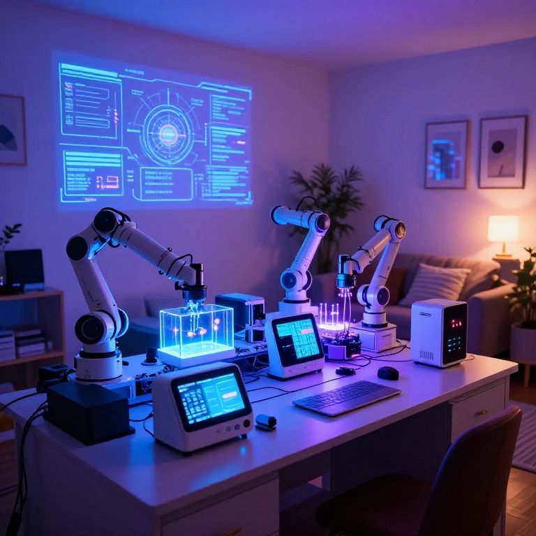 Ai home laboratory featuring rows of smart devices, automated robotic arms assembling gadgets, glowing blue and purple ambient lights, digital schematics projected in the air, a blend of cutting edge AI research and cozy home comfort, sci-fi atmosphere