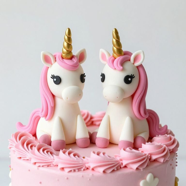 Two enchanting unicorn figures, crafted in whimsical fondant with golden horns and flowing pink manes, sit serenely atop a cake adorned with swirling pink frosting, creating a magical and otherworldly dessert masterpiece.