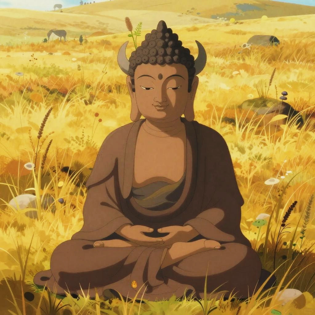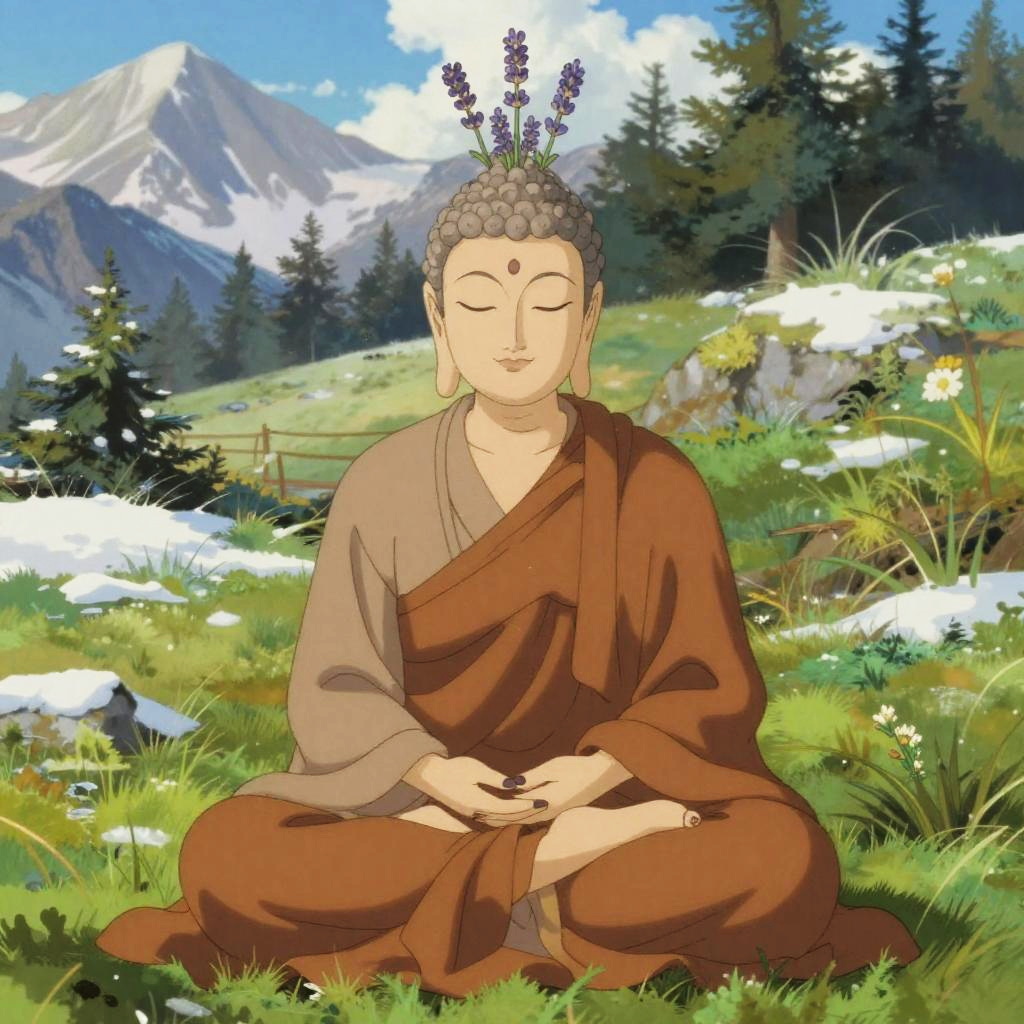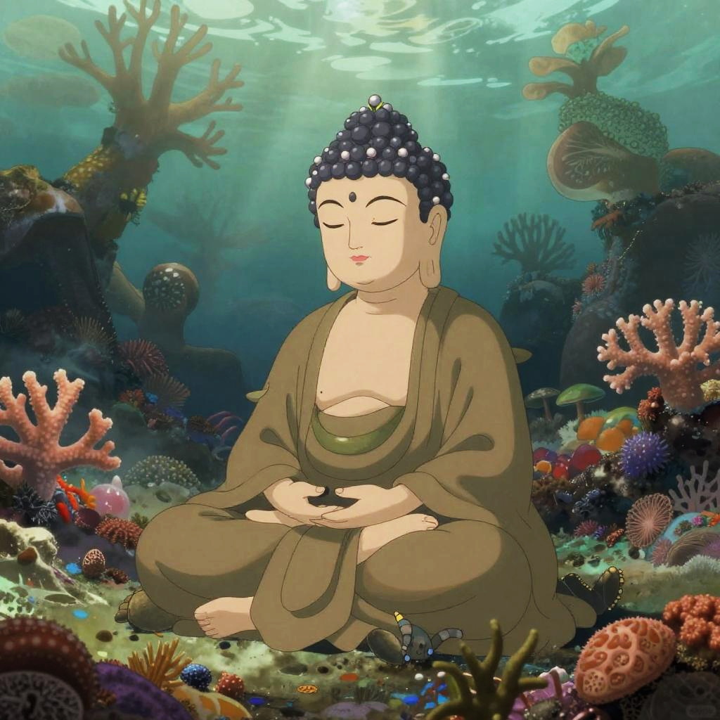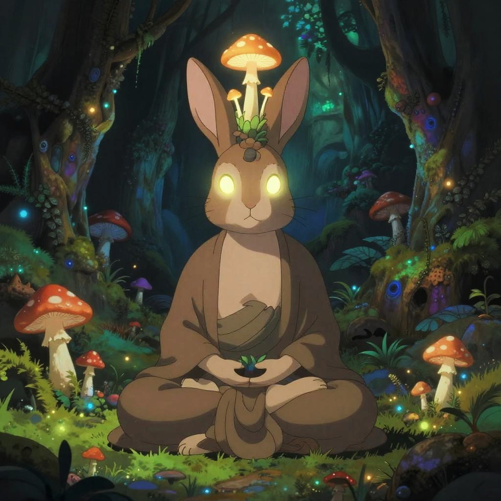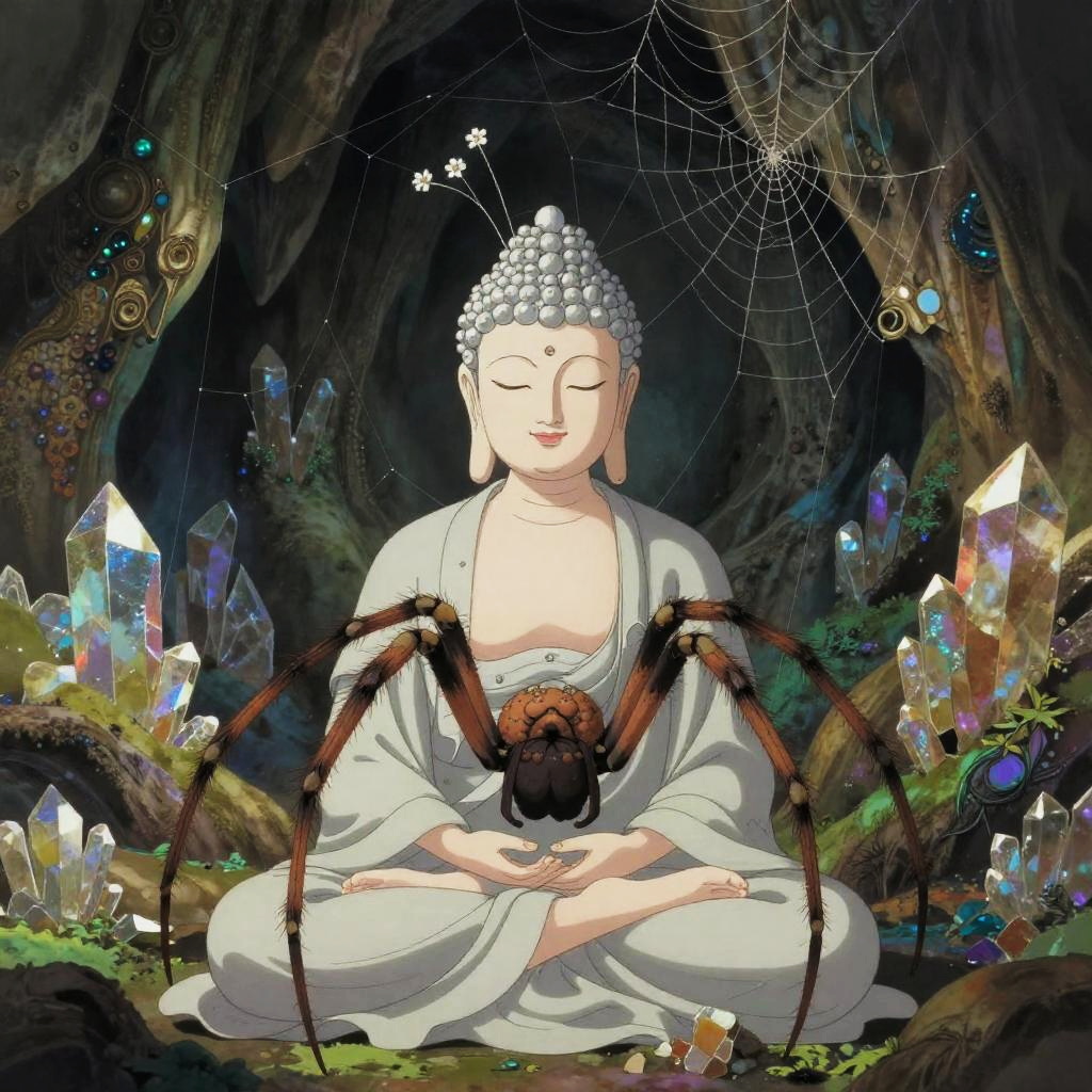 A ethereal spider oracle, delicate and profound meditating like a Buddha, with an ancient and serene expression. Small silken webs sprout from the top of his head, adding a whimsical touch. The scene is set in a lush crystalline cave, with vibrant, earthy tones inspired by Futuristic Mysticism. The composition blends anime elements with a fantastical, mystical atmosphere, creating a serene yet surreal mood.