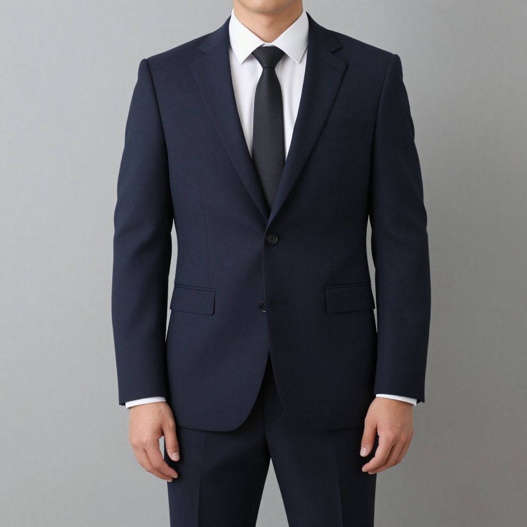 Photograph of a person from the neck to the waist, wearing a dark navy blue, single-breasted suit jacket with a single button fastened, paired with a white dress shirt and a black tie. The suit jacket has two flap pockets on the chest and two side pockets. The background is plain and light gray, providing a neutral contrast to the dark suit. The subject's hands are relaxed at their sides, and the image is centered, focusing on the formal attire. The lighting is even, highlighting the smooth texture of the suit fabric and the crispness of the shirt and tie.