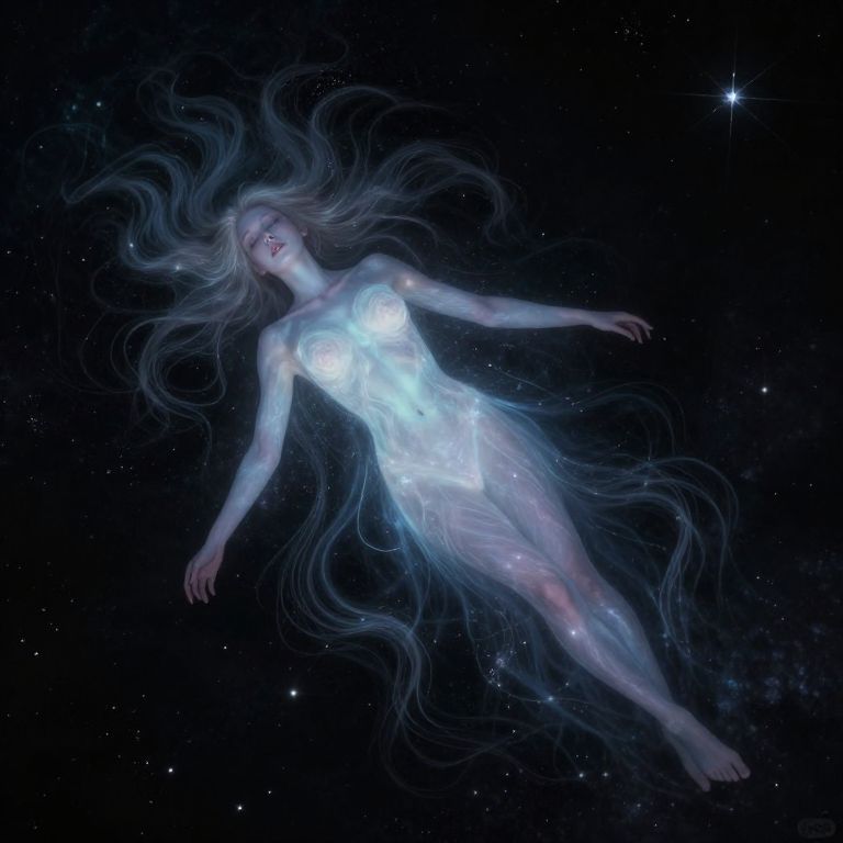 Digital art depicting a glowing, ethereal woman floating in a dark, star-filled space. She has long, flowing, silver-blue hair that radiates around her. Her luminous, translucent body is illuminated with soft, blue-white light, revealing her slender physique and delicate features. She is nude, with her breasts and genitals subtly obscured by the light. Her arms and legs are slightly spread, as if weightless. The background is a deep black, dotted with small, twinkling stars, and a brighter star is visible in the top right corner. The overall composition evokes a sense of otherworldliness and serenity.
