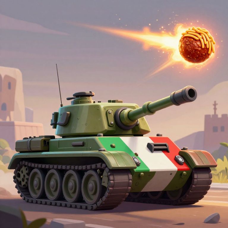 Digital art of a green tank with Italian flag stripes firing a glowing, orange explosive round in a sunlit, desert-like cityscape.