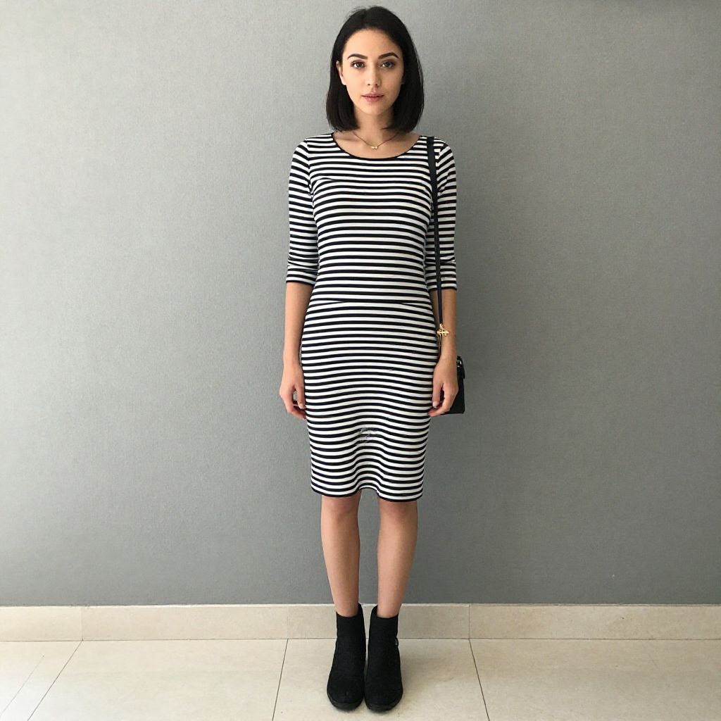 "Woman, casual, horizontal striped knee-length dress in black and white, three-quarter sleeves, round neckline, paired with black ankle boots, carries a small black shoulder bag.. Sexy. Pretty face and beаutiful eyes. Big breasts."