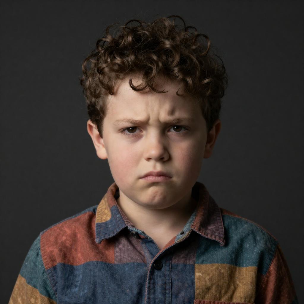 Photograph of a chubby young boy with curly brown hair, wearing a colorful patterned shirt, looking slightly annoyed. Dark, blurred background. Close-up, centered on his face and upper chest.
