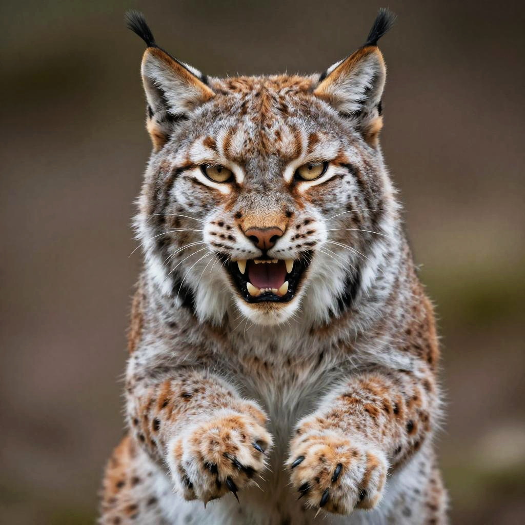 Eurasian lynx with an angry intense fierce snarl with ears flattened and eyes blazing flexing extended foreclaws and bared fangs, whiskers flared. Realistic photo, uhd, Nikon D850, 300mm