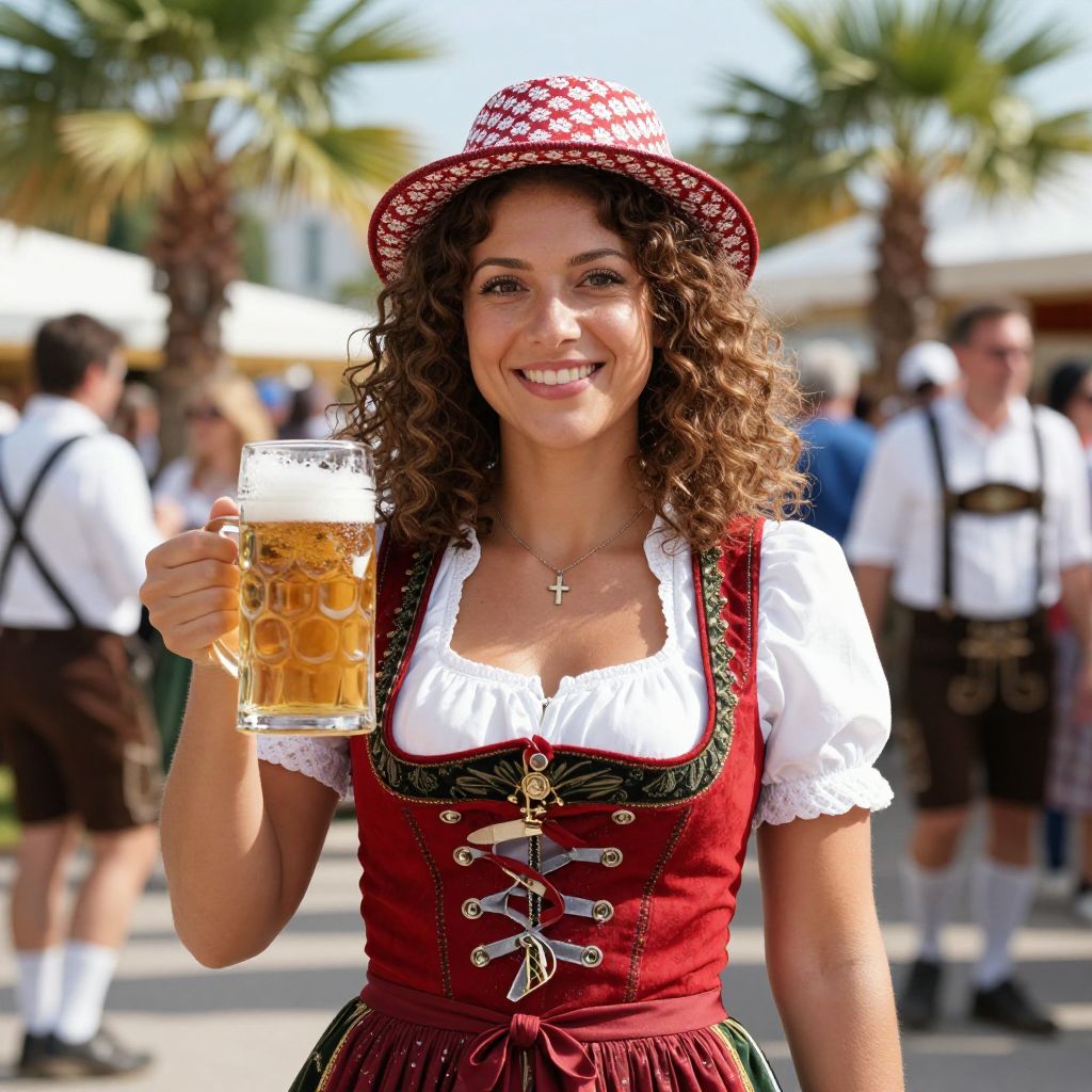 Photograph of a smiling woman with curly brown hair wearing a red, white-patterned hat and a traditional German dirndl dress with a red corset and white blouse. She holds a frothy beer mug in her right hand. Background shows a sunny outdoor scene with palm trees, blurred people in Bavarian attire, and a festive atmosphere. She has a small cross necklace and is standing in the foreground.