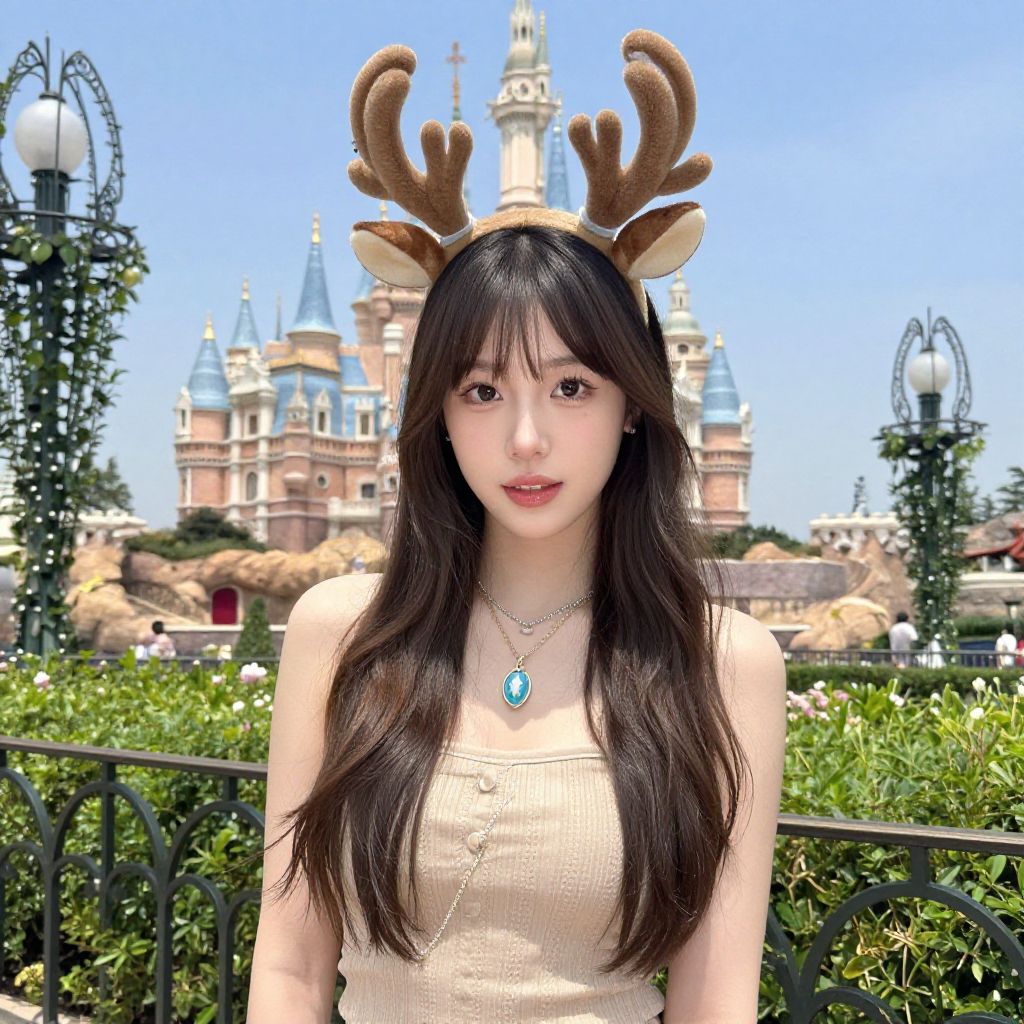 "Disney Nuimos Outfit, dressed in a costume with deer horns and a necklace"